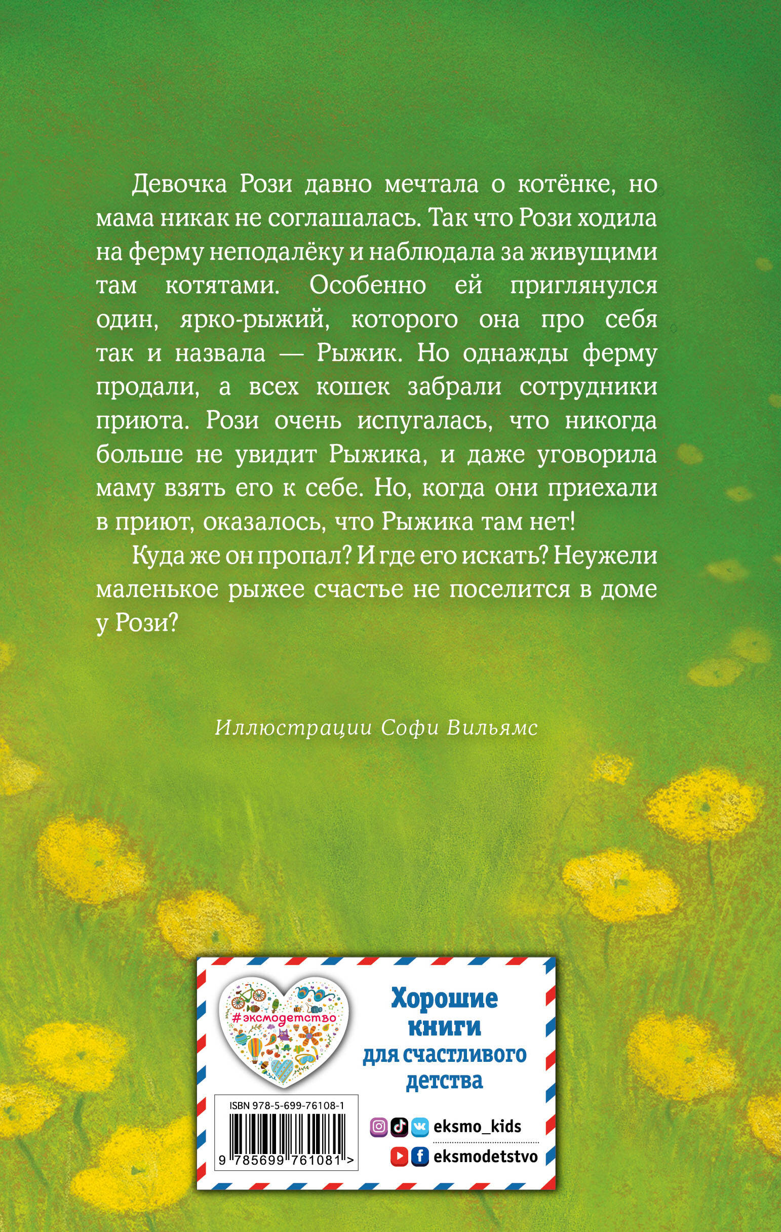 Девочка Рози давно мечтала о котёнке, но мама никак не соглашалась. Так что Рози ходила на ферму неподалеку и наблюдала за живущими там котятами. Особенно ей приглянулся один, ярко-рыжий, которого она про себя так и назвала - Рыжик. Но однажды ферму продали, а всех кошек забрали сотрудники приюта. Рози очень испугалась, что никогда больше не увидит Рыжика, и даже уговорила маму взять его к себе. Но, когда они приехали в приют, оказалось, что Рыжика там нет! Куда же он пропал? И где его искать? Неужели маленькое рыжее счастье не поселится в доме у Рози? Серия-бестселлер! Дети по всему миру обожают эти книги про котят и щенят! Истории Холли Вебб бережно учат чуткости, любви, доброте и ответственности. Книга издана на белой бумаге, внутри крупный шрифт и потрясающие чёрно-белые иллюстрации, которые позволят детям переключать внимание, не нагружая чрезмерно глаза. Идеальна для родителей, которые хотят, чтобы дети втянулись в чтение.| Издательство | ООО "Издательство "Эксмо" |