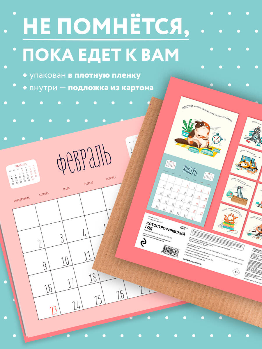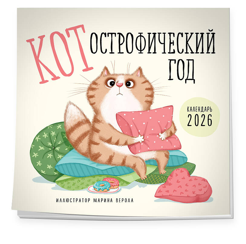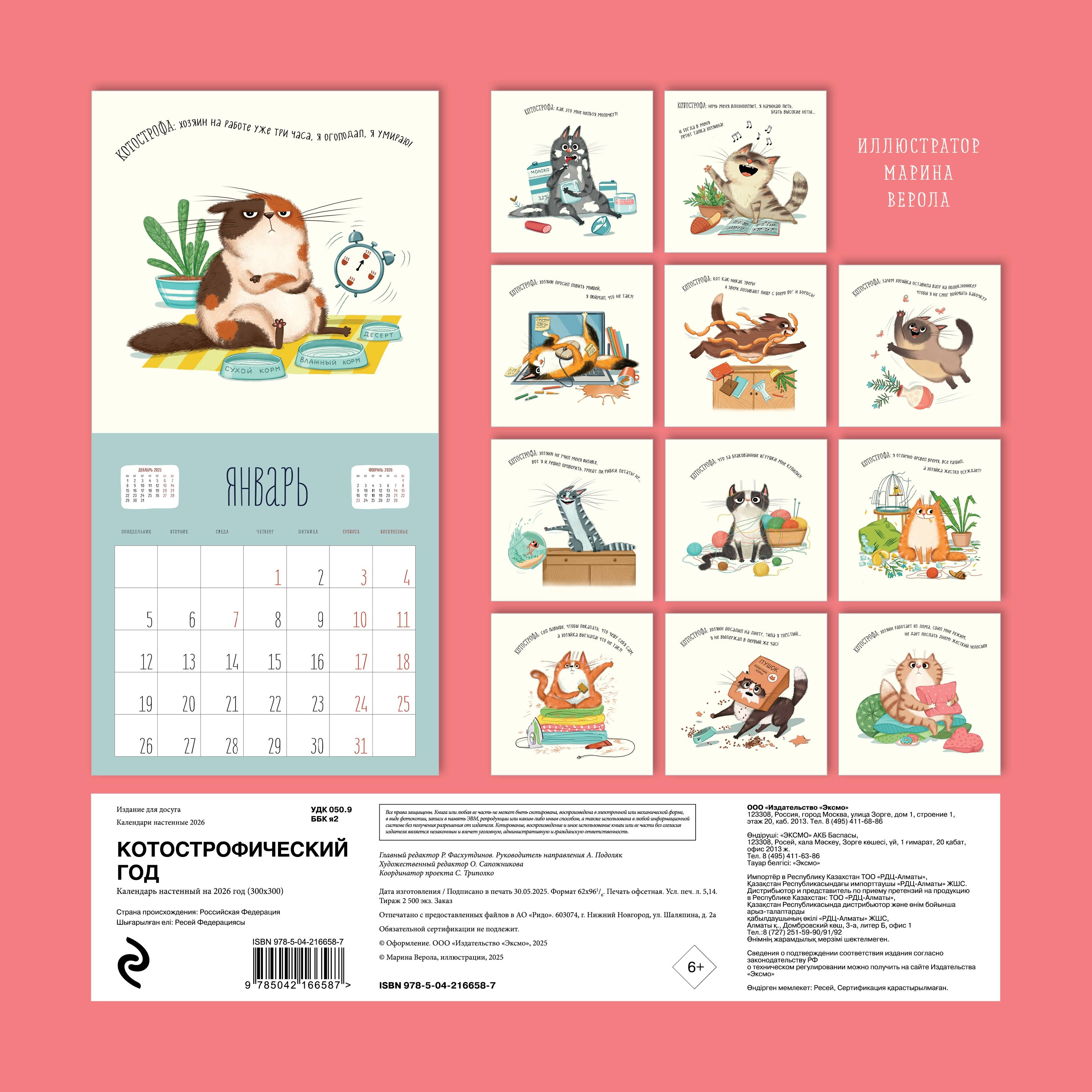 О серии: Наши настенные календари отличаются высоким качеством исполнения! Тщательно подобранные иллюстрации, напечатанные на глянцевой бумаге высочайшего качества, станут настоящим украшением дома, а в календарной сетке найдется место для ваших планов: большие клетки позволят делать записи и организовать свой год! В календаре также отмечены все государственные праздники. О календаре: Календарь с 12 иллюстрациями забавных котов от популярной художницы Марины Веролы. Для кого: Для всех поклонников котов и добрых иллюстраций Марины Веролы. Технические параметры: Тип календаря - настенный перекидной. Год - 2026. Календарная сетка - с разбивкой по месяцам. Вид скрепления - скрепка. Ширина - 30 см. Высота - 30 см. Внутренний блок - мелованная бумага 115 г/м2. Подложка - плотный гофрокартон для поддержания формы. Индивидуальная упаковка в плотный целлофановый пакет.| Издательство | ООО "Издательство "Эксмо" |
