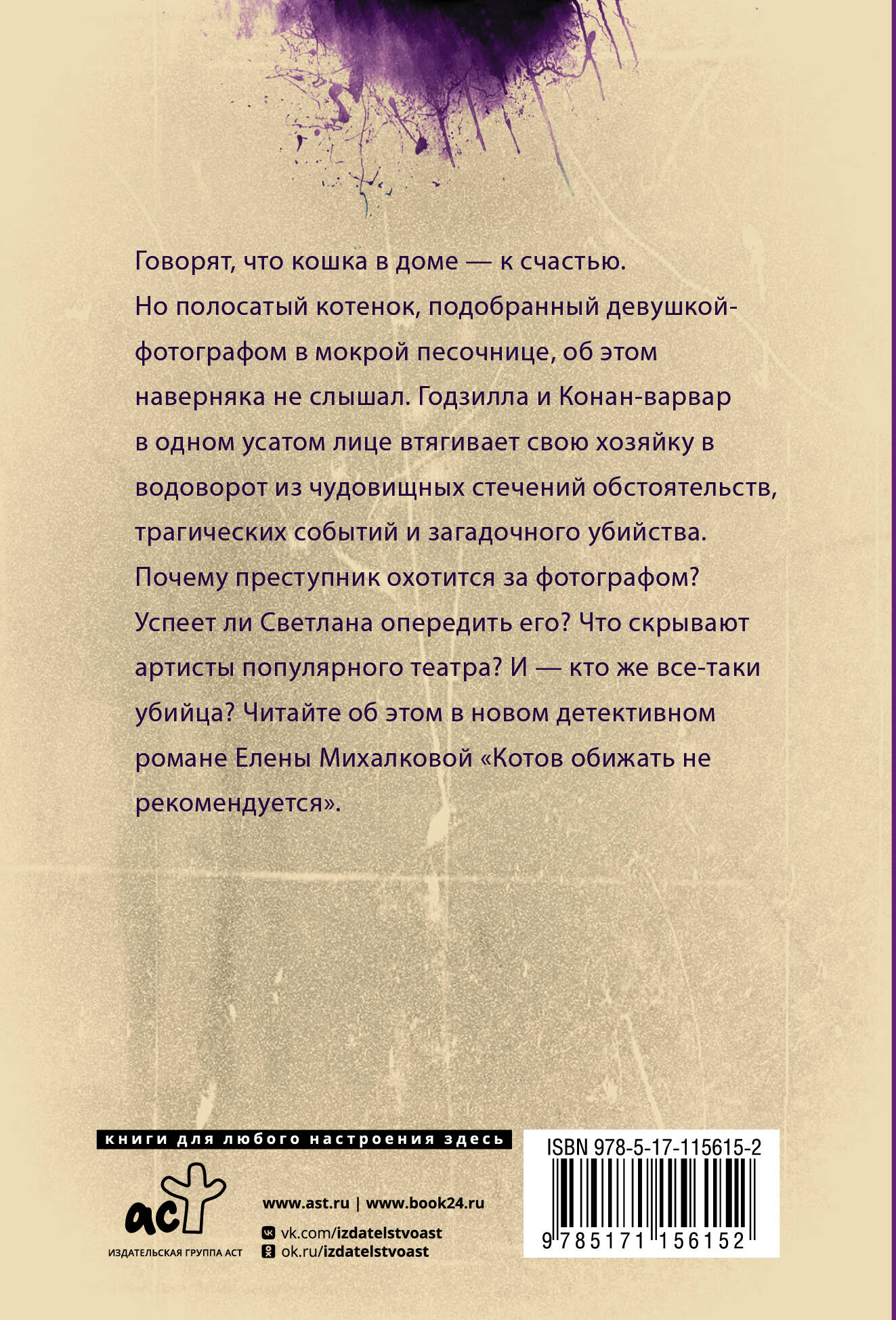 Говорят, что кошка в доме - к счастью. Но полосатый котенок, подобранный девушкой-фотографом в мокрой песочнице, об этом наверняка не слышал. Годзилла и Конан-варвар в одном усатом лице втягивает свою хозяйку в водоворот из чудовищных стечений обстоятельств, трагических событий и загадочного убийства. Почему преступник охотится за фотографом? Успеет ли Светлана опередить его? Что скрывают артисты популярного театра? И - кто же все-таки убийца? Читайте об этом в новом детективном романе Елены Михалковой "Котов обижать не рекомендуется".| Издательство | Издательство "АСТ" |