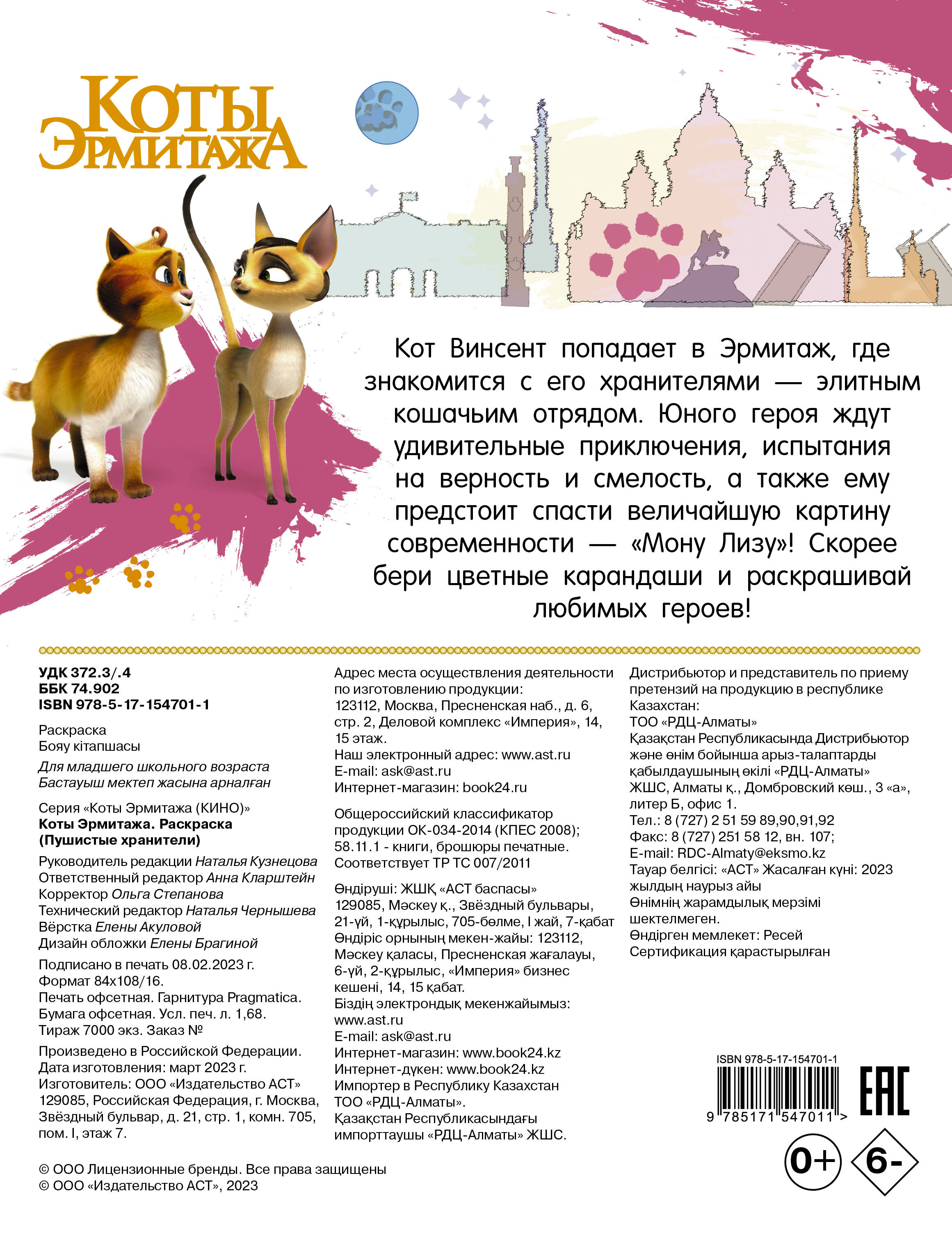 Кот Винсент попадает в Эрмитаж, где знакомится с его хранителями - элитным кошачьим отрядом. Юного героя ждут удивительные приключения, испытания на верность и смелость, а также ему предстоит спасти величайшую картину современности - "Мону Лизу"! Скорее бери цветные карандаши и раскрашивай любимых героев!| Издательство | ИЗДАТЕЛЬСТВО "АСТ" |