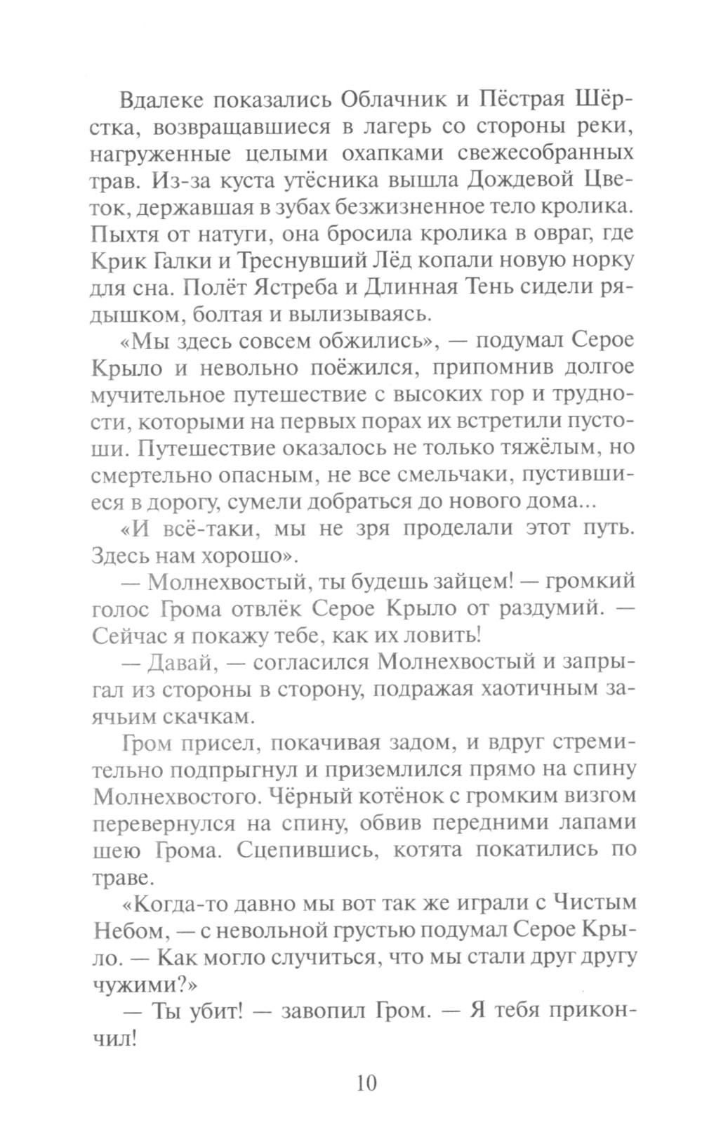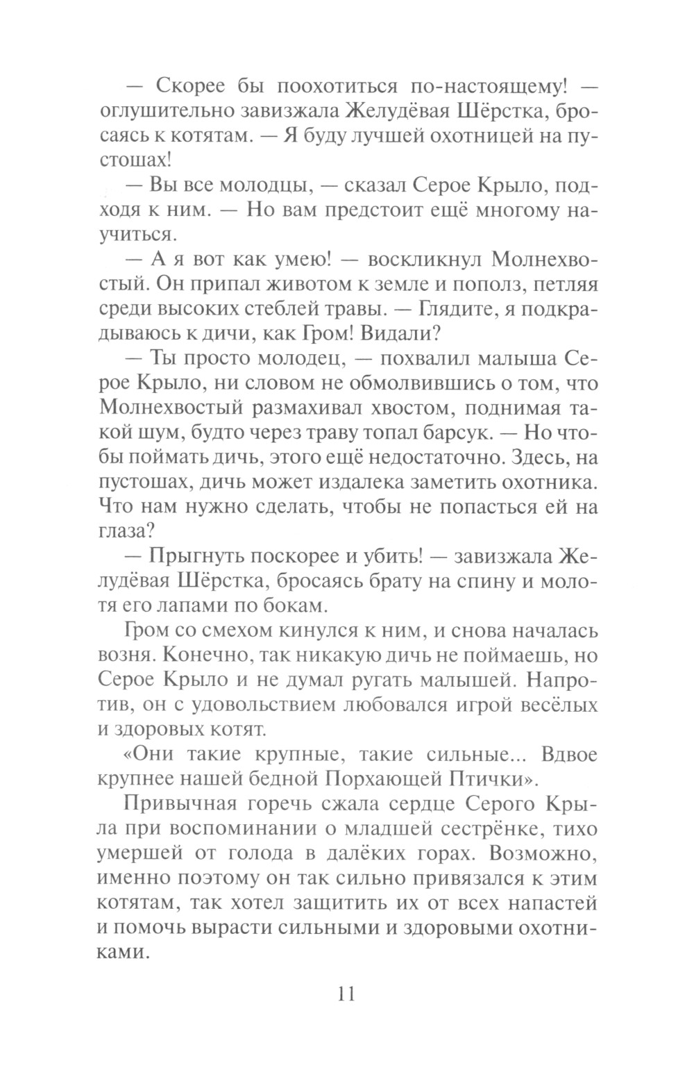 Горные коты наконец-то достигли желанных земель, где вдоволь дичи, им ничто не угрожает, и они в полной мере могут проявить свои способности. Но напряжение между разделившимися переселенцами постепенно нарастает. Чистое Небо жёстко контролирует свои лесные территории, не позволяя охотиться на них ни бывшим друзьям, ни местным одиночкам. Его брат Серое Крыло, обитающий на пустошах, против таких порядков, он уверен, что все должны жить мирно и помогать друг другу. Молодой кот Гром, сын Чистого Неба и воспитанник Серого Крыла, оказывается в центре борьбы за власть, влияние и территории. Ему предстоит сделать трудный выбор между принципами жизни отца и дяди.
