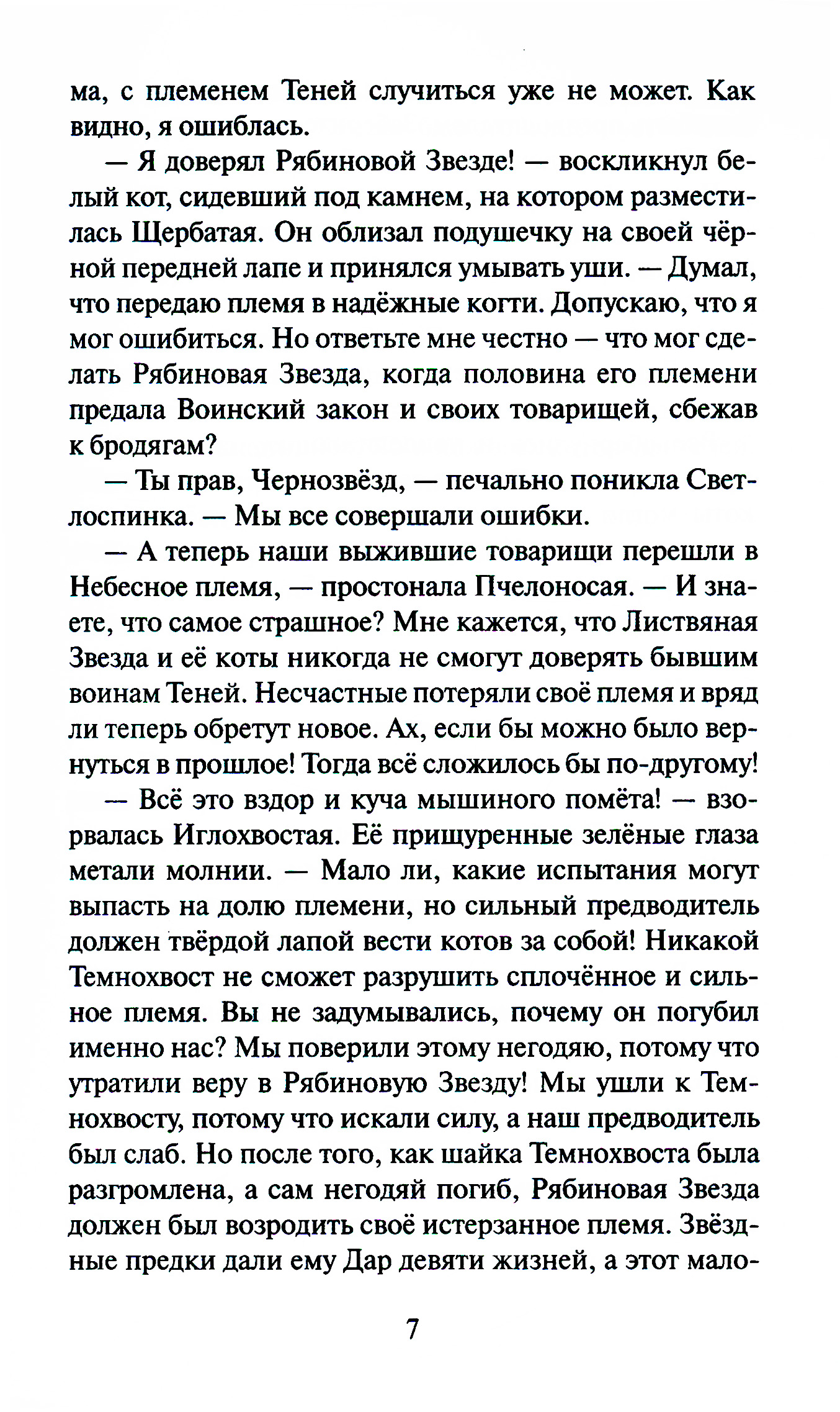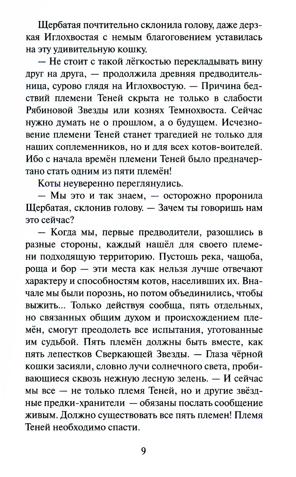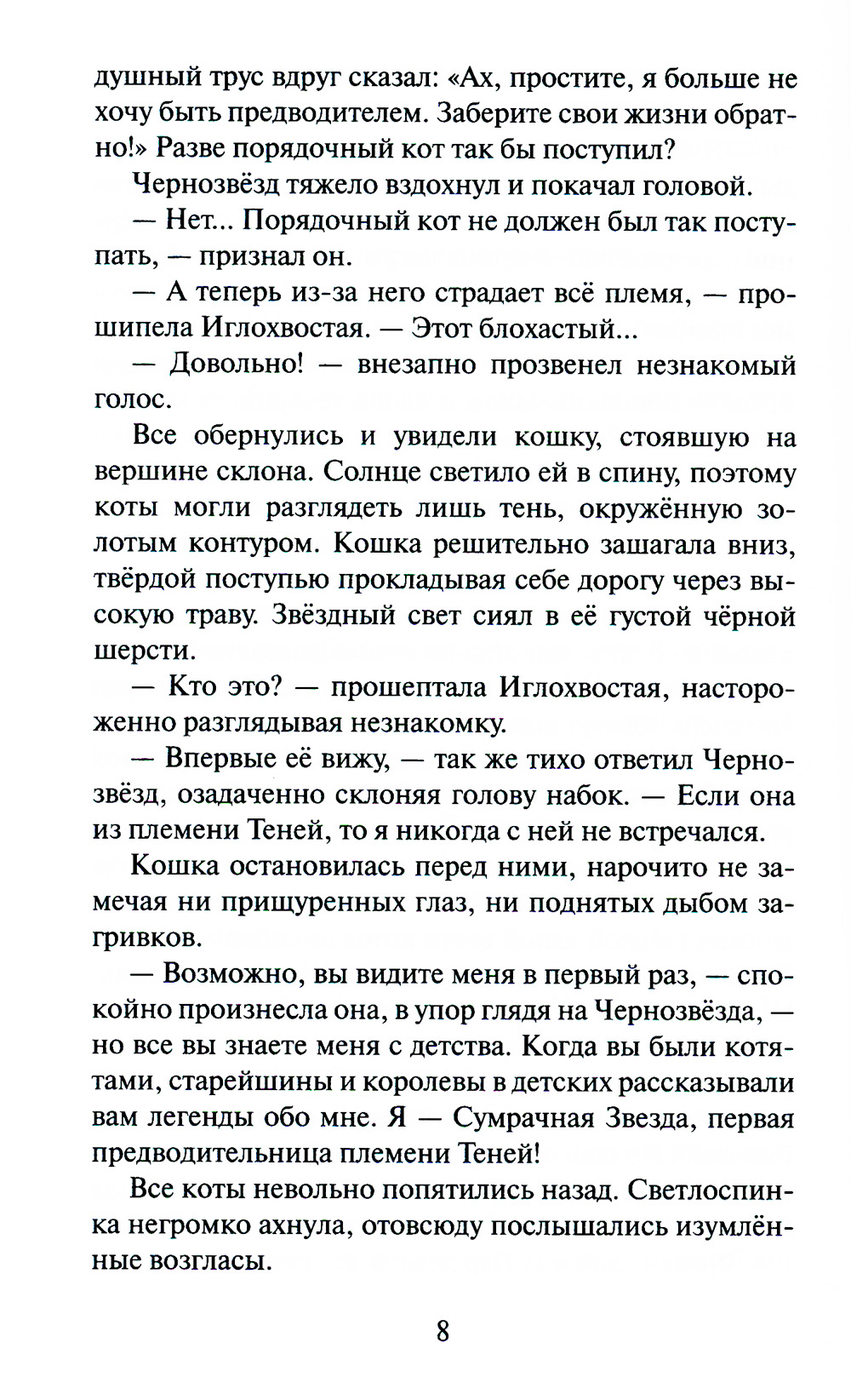 Много лун миновало с тех пор, как коты-воители освободились от власти безжалостного Темнохвоста и его приспешников. Однако грозовые тучи грядущих невзгод по-прежнему застилают небеса. Пророчество предков остаётся неизменным - в лесу должны существовать все пять племён, иначе сами звёзды погаснут, а память о воителях будет навсегда предана забвению. Но как предотвратить эту катастрофу, если племя Теней перестало существовать, а его воины перешли в Небесный лагерь? Верные звёздным предкам коты упорно продолжают искать способ возродить племя Теней, однако все их усилия остаются напрасными. С каждым днём ситуация становится всё тревожнее. В Небесном лагере вот-вот случится раскол, в Грозовом - свирепствует жестокая болезнь, а Речной становится жертвой бушующего пожара. Тем временем в лесу зреет новый заговор: бандиты из бывшей шайки Темнохвоста готовят жестокую месть, и вскоре земля вновь обагрится кровью. Лишь чудо может спасти всех и возродить племя Теней - только вот осталась ли у котов надежда на чудеса?| Издательство | Просвещение |