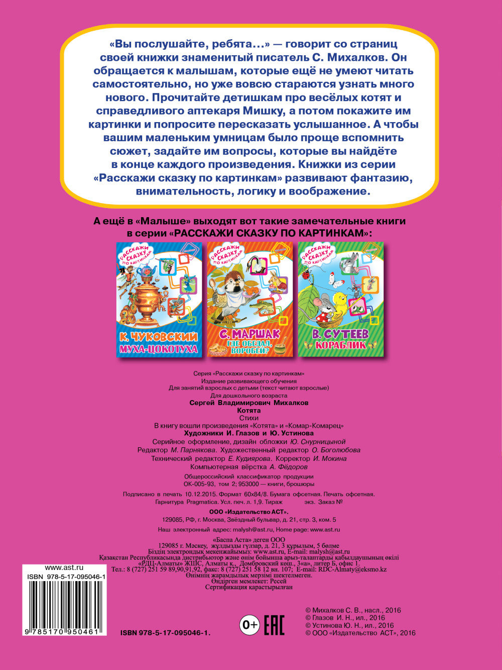 «Вы послушайте, ребята…» - говорит со страниц своей книжки знаменитый писатель С. Михалков. Он обращается к малышам, которые ещё не умеют читать самостоятельно, но уже вовсю стараются узнать много нового. Прочитайте детишкам про весёлых котят и справедливого аптекаря Мишку, а потом покажите им картинки и попросите пересказать услышанное. А чтобы вашим маленьким умница было проще рассказать сюжет, задайте им вопросы, которые вы найдёте в конце каждого произведения. Книжки из серии «Расскажи сказку по картинкам» развивают речь, фантазию, внимательность, логику и воображение.| Автор/составитель | Михалков С.В. |