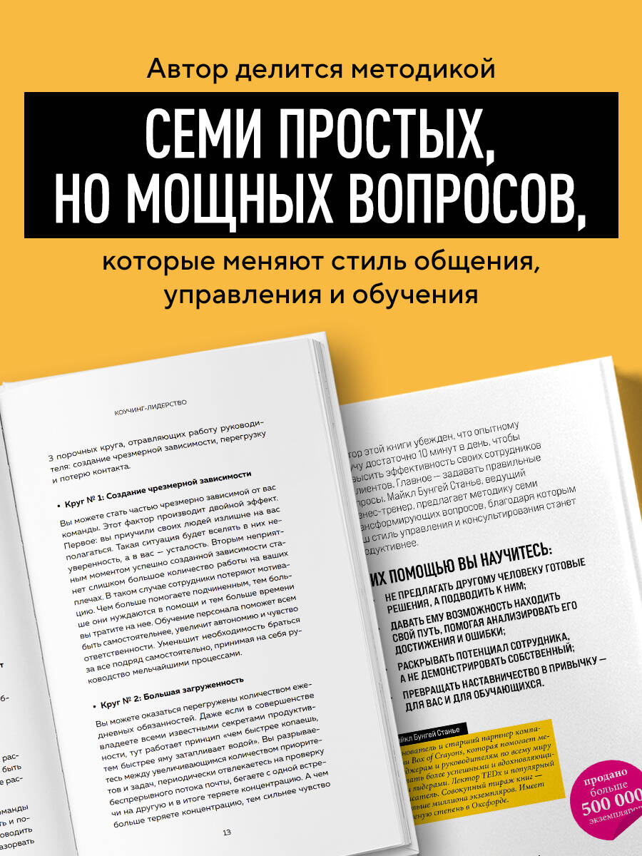 Автор этой книги убежден, что опытному коучу достаточно 10 минут в день, чтобы повысить эффективность своих сотрудников и клиентов. Главное - задавать правильные вопросы. Майкл Бенгей Стейнер, ведущий бизнес-тренер, предлагает методику семи трансформирующих вопросов, благодаря которым ваш стиль управления и консультирования станет продуктивнее. С их помощью вы научитесь: • не предлагать другому человеку готовые решения, а подводить к ним; • давать ему возможность находить свой путь, помогая анализировать его достижения и ошибки; • раскрывать потенциал сотрудника, а не демонстрировать собственный; • превращать наставничество в привычку - для вас и для обучающихся. Майкл Бенгей Стейнер - основатель и старший партнер компании Box of Crayons, которая помогает менеджерам и руководителям по всему миру стать более успешными и вдохновляющими лидерами. Лектор TEDx и популярный писатель. Совокупный тираж книг - больше миллиона экземпляров. Имеет ученую степень в Оксфорде. Продано больше 500 000 экземпляров.| Издательство | Эксмо |