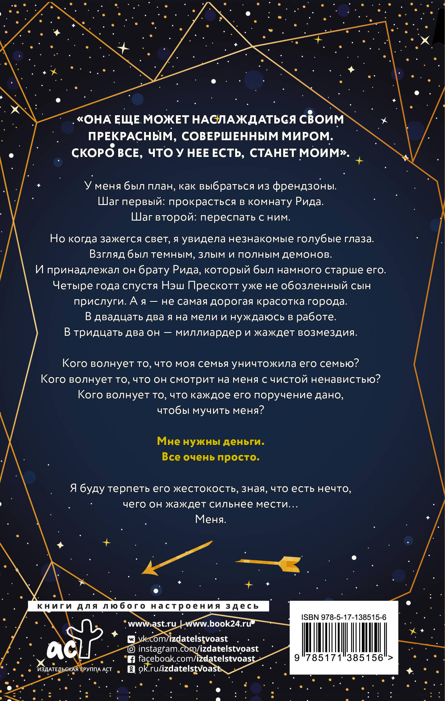 У меня был план, как выбраться из френдзоны. Шаг первый: прокрасться в комнату Рида. Шаг второй: переспать с ним. Но когда зажегся свет, я увидела незнакомые голубые глаза. Взгляд был темным, злым и полным демонов. И принадлежал он брату Рида, который был намного старше. Четыре года спустя Нэш Прескотт уже не обозленный сын прислуги. А я - не самая дорогая красотка города. В двадцать два я на мели и нуждаюсь в работе. В тридцать два он - миллиардер и жаждет возмездия. Кого волнует то, что моя семья уничтожила его семью? Кого волнует то, что он смотрит на меня с чистой ненавистью? Кого волнует то, что каждое его поручение дано, чтобы мучить меня? Мне нужны деньги. Все очень просто. Я буду терпеть его жестокость, зная, что есть нечто, чего он жаждет сильнее мести… Меня.| Издательство | АСТ |