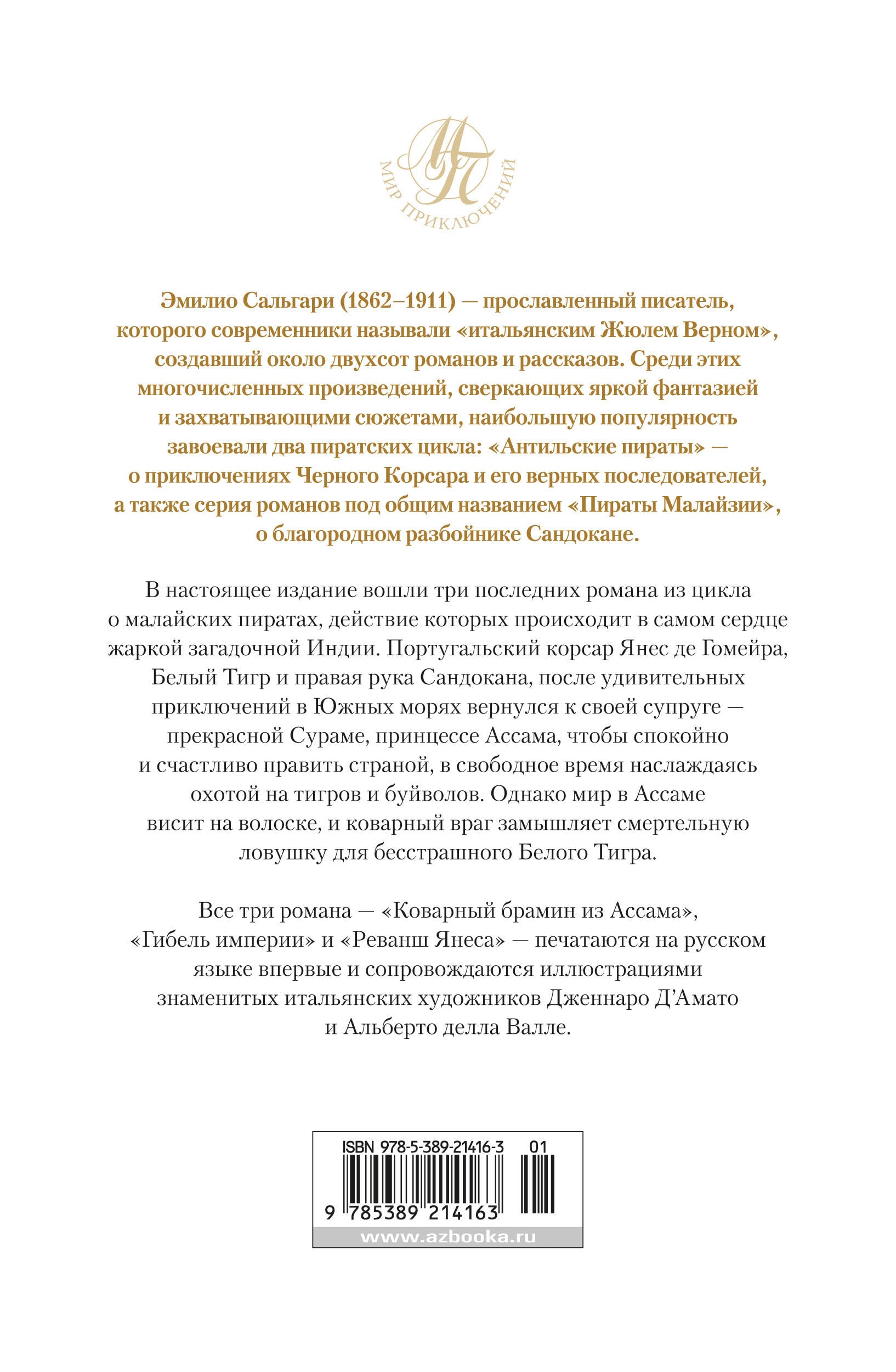 Впервые на русском - три последних романа Эмилио Сальгари о благородном пирате Сандокане и его верных товарищах! Португальский корсар Янес де Гомейра, Белый Тигр и правая рука Сандокана, после удивительных приключений в Южных морях вернулся к своей супруге - прекрасной Сураме, принцессе Ассама, чтобы спокойно и счастливо править страной, в свободное время наслаждаясь охотой на тигров и буйволов. Однако мир в Ассаме висит на волоске, и коварный враг замышляет смертельную ловушку для бесстрашного Белого Тигра. Есть только один человек, способный сразиться с грозной армией индийских захватчиков и спасти жизнь Янесу, однако он остался в далекой Малайзии. Успеет ли Сандокан прийти на помощь своему лучшему другу, чтобы, как в старые времена, сразиться вместе с ним против армии хитрых и жестоких индийцев?.. Все три романа - "Коварный брамин из Ассама", "Гибель империи" и "Реванш Янеса" - сопровождаются иллюстрациями знаменитых итальянских художников Дженнаро Д'Амато и Альберто делла Валле.| Издательство | Азбука-Аттикус Издат.группа ООО |