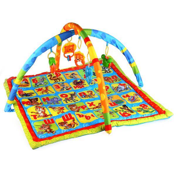 Детский игровой коврик с мягкими игрушками на подвеске станет отличным помощником для родителей. Он выполнен из мягкого, гипоаллергенного материала, безопасного для ребёнка. На поверхности нанесены изображения зверей и птиц, соответствующие им буквы алфавита. В комплекте прилагается 2 дуги, на которые можно повесить 5 мягких игрушек. Звуковые эффекты и яркие цвета позволят увлечь малыша надолго. Развивает мелкую моторику, цветовосприятие, слух, осязание, визуальное восприятие, координацию движений. Рекомендовано детям от 6 месяцев.