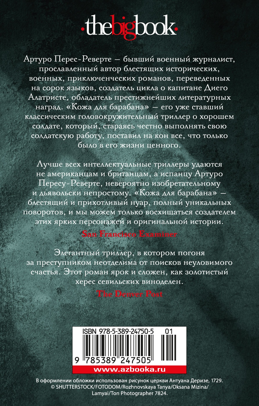 Неизвестный хакер проникает в личный компьютер папы римского и оставляет сообщение о севильской церкви, которая «убивает, чтобы себя защитить». Секретная служба Ватикана отряжает в Севилью Лоренцо Куарта, эмиссара Института внешних дел, и в поисках таинственного хакера тот погружается в хитросплетения церковной политики, большого бизнеса и коррупции: детективное расследование затягивает его, плотские соблазны манят и опасность грозит не только его жизни, но и его вере и обетам… Артуро Перес-Реверте - бывший военный журналист, прославленный автор блестящих исторических, военных, приключенческих романов, переведенных на сорок языков, создатель цикла о капитане Диего Алатристе, обладатель престижнейших литературных наград. «Кожа для барабана» - его уже ставший классическим головокружительный триллер о хорошем солдате, который, стараясь честно выполнять свою солдатскую работу, поставил на кон все, что только было в его жизни ценного.| Издательство | Азбука |