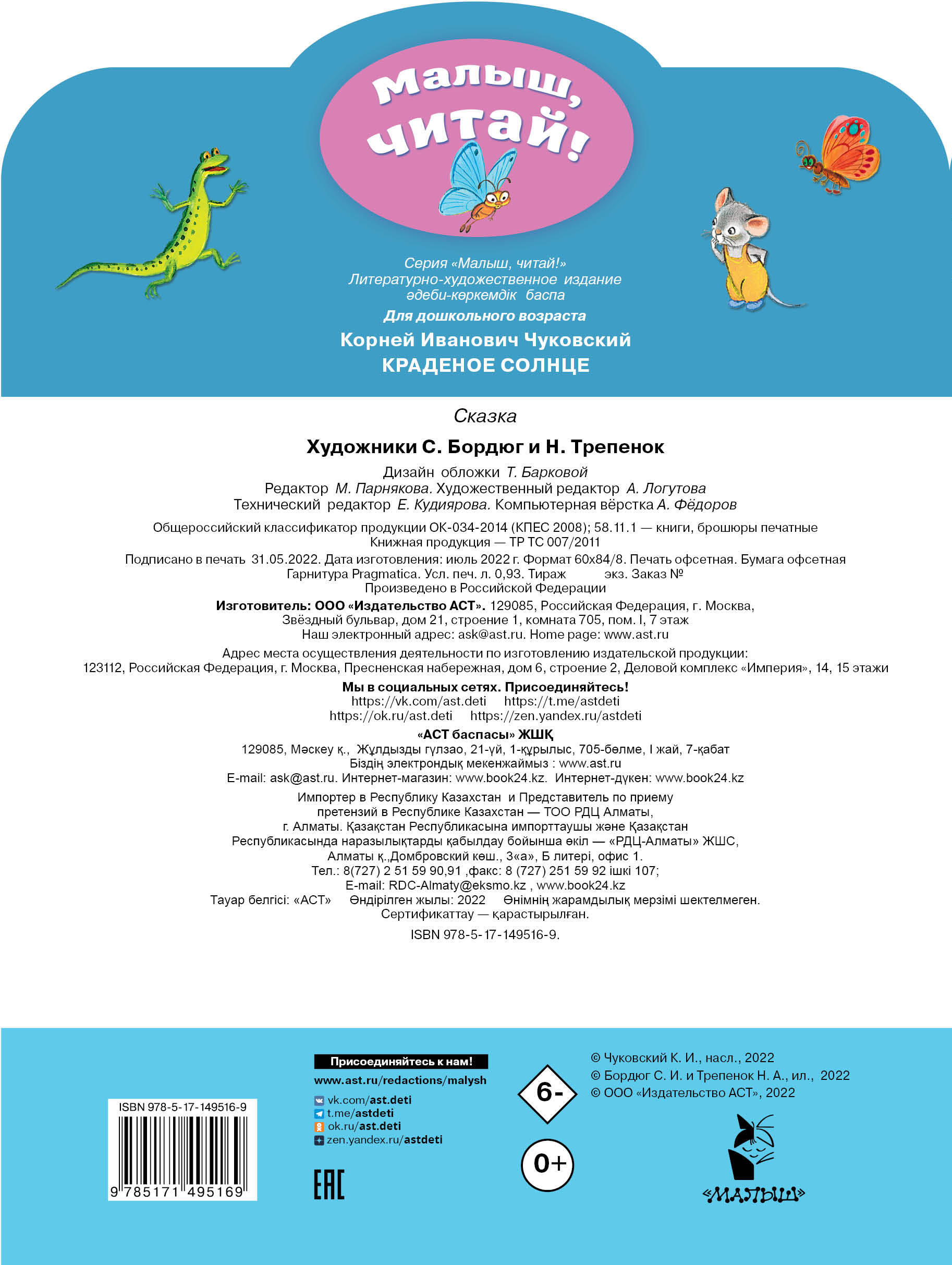 Однажды гуляло солнышко по небу и зашло за тучку. А это была вовсе не туча,а самый настоящий Крокодил, который солнце и проглотил! Прочитайте знаменитую сказку К. Чуковского "Краденое солнце" и помогите зверям победить Крокодила, чтобы на небе всегда сияло солнышко и было тепло. Для дошкольного возраста.| Издательство | АСТ |