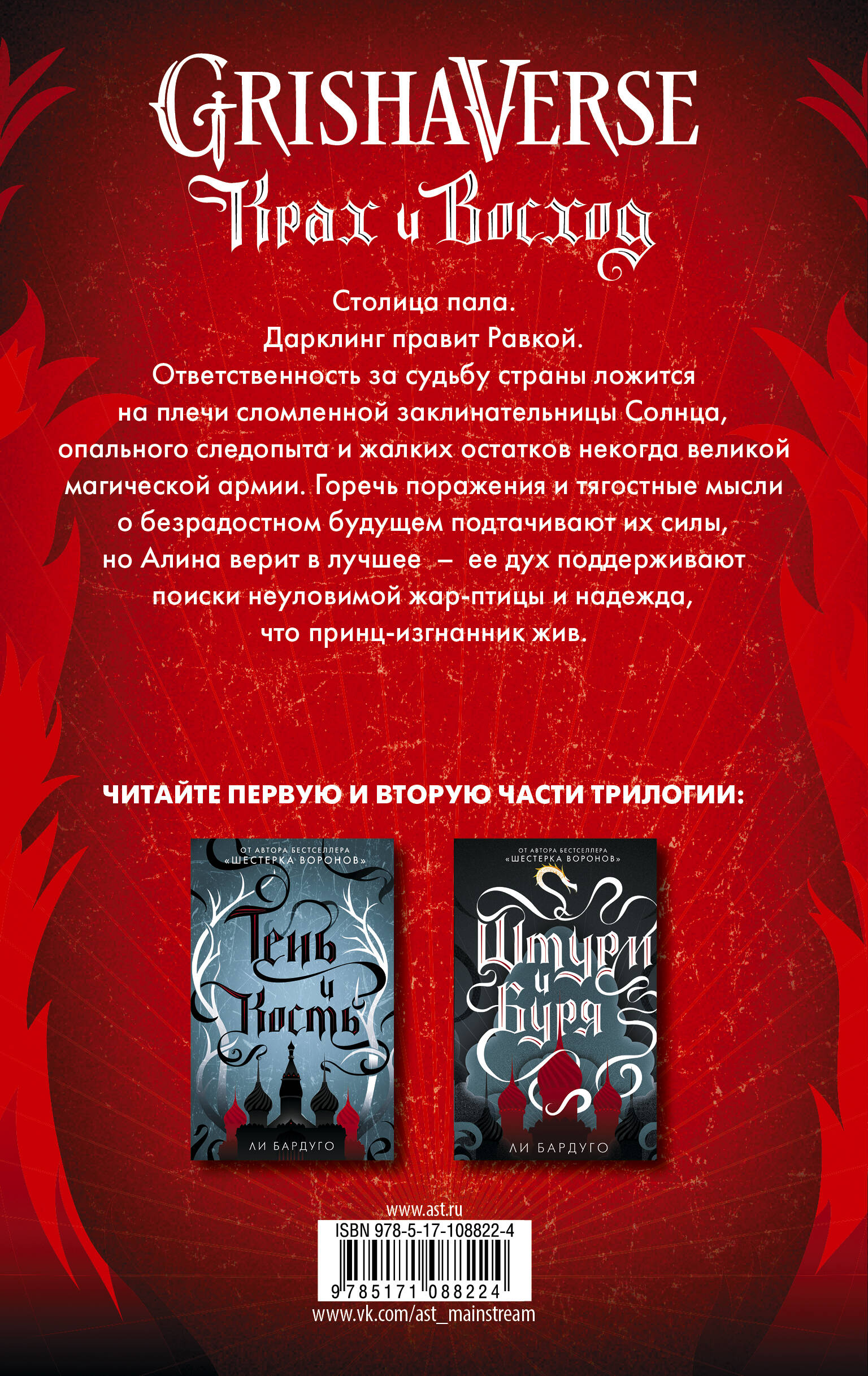 "Крах и восход" - заключительная часть трилогии "Тень и кость" от пулярного молодежного автора Ли Бардуго. Недавно вышедший на основе вселенной сериал от Netflix взорвал мировые чарты и заставил подростков и взрослых по всему миру в очередной раз заинтересоваться книгами и чтением. Grishaverse - уникальный мир, на который Ли Бардуго вдохновила славянская культура. Герои пьют квас и зовут друг друга привычными для нашего уха именами - Алина, Николай, Зоя. Трилогия заставляет читателя по-новому посмотреть на свою действительность под новым, более романтичным углом. В оригинале продано более 2,5 миллионов копий! Серия переведена на 38 языков.| Издательство | ИЗДАТЕЛЬСТВО "АСТ" |