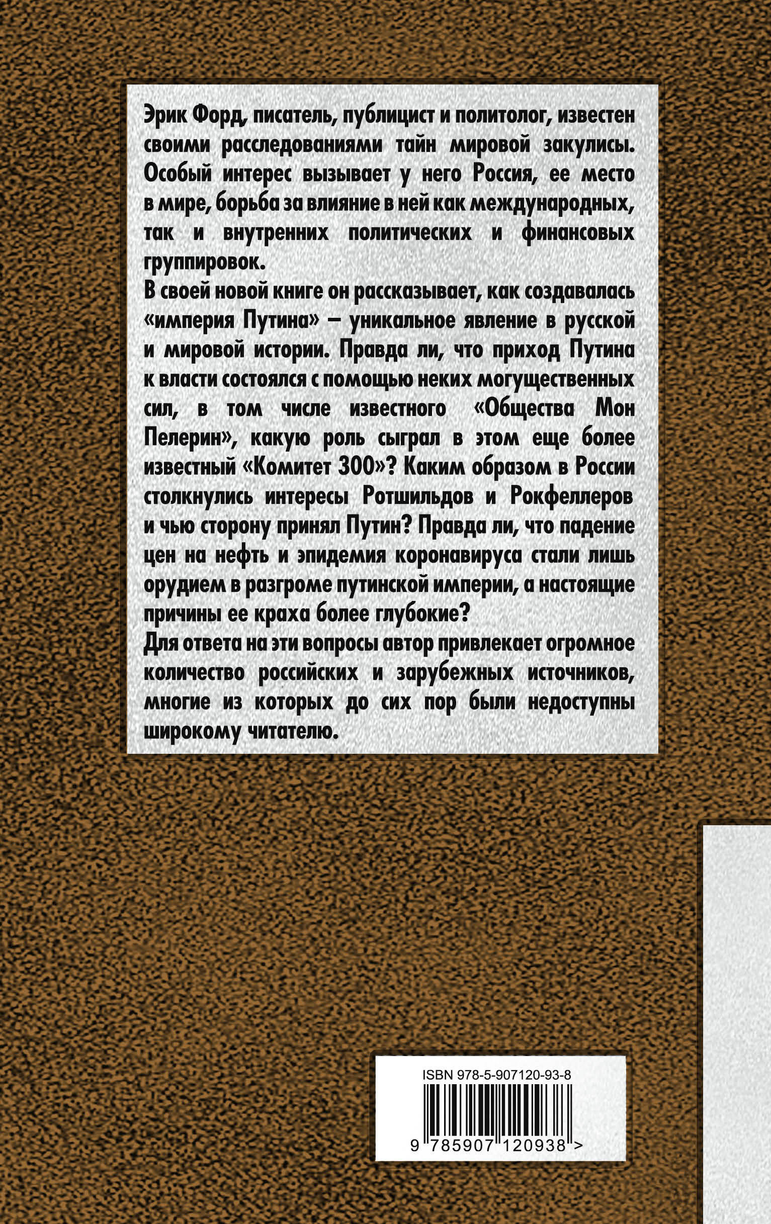 Эрик Форд, писатель, публицист и политолог, известен своим расследованиями тайн мировой закулисы. Особой интерес вызывает у него Россия, ее место в мире, борьба за влияние в ней как международных, так и внутренних политических и финансовых группировок. В своей новой книге он рассказывает, как создавалась «империя Путина» - уникальное явление в русской и мировой истории. Правда ли, что приход Путина к власти состоялся с помощью неких могущественных сил, в том числе известного ««Общества Мон Пелерин», какую роль сыграл в этом еще более известный «Комитет 300»? Каким образом в России столкнулись интересы Ротшильдов и Рокфеллеров и чью сторону принял Путин? Правда ли, что падение цен на нефть и эпидемия коронавируса стали лишь орудием в разгроме путинской империи, а настоящие причины ее краха более глубокие? Для ответа на эти вопросы автор привлекает огромное количество российских и зарубежных источников, многие из которых до сих пор были недоступны широкому читателю.| Издательство | Агентство Алгоритм ООО |
