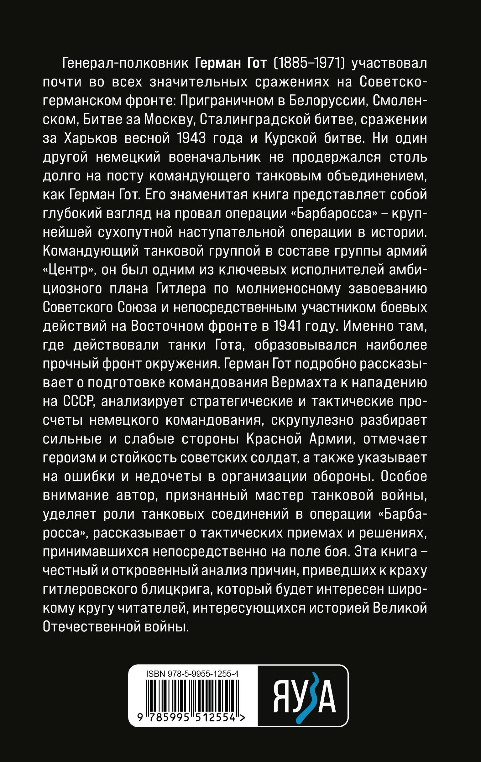 Генерал-полковник Герман Гот (1885-1971) участвовал почти во всех значительных сражениях на Советско-германском фронте: Приграничном в Белоруссии, Смоленском, Битве за Москву, Сталинградской битве, сражении за Харьков весной 1943 года и Курской битве. Ни один другой немецкий военачальник не продержался столь долго на посту командующего танковым объединением как Герман Гот. Его знаменитая книга представляет собой глубокий взгляд на провал операции «Барбаросса» - крупнейшей сухопутной наступательной операции в истории. Командующий танковой группой в составе группы армий «Центр» он был одним из ключевых исполнителей амбициозного плана Гитлера по молниеносному завоеванию Советского Союза и непосредственным участником боевых действий на Восточном фронте в 1941 году. Именно там, где действовали танки Гота, образовывался наиболее прочный фронт окружения. Герман Гот подробно рассказывает о подготовке командования Вермахта к нападению на СССР, анализирует стратегические и тактические просчеты немецкого командования, скрупулезно разбирает сильные и слабые стороны Красной Армии, отмечает героизм и стойкость советских солдат, а также указывает на ошибки и недочеты в организации обороны. Особое внимание автор, признанный мастер танковой войны, уделяет роли танковых соединений в операции «Барбаросса», рассказывает о тактических приемах и решениях, принимавшихся непосредственно на поле боя. Эта книга - честный и откровенный анализ причин, приведших к краху гитлеровского блицкрига, который будет интересен широкому кругу читателей, интересующихся историей Великой Отечественной войны.| Издательство | Яуза-пресс ООО |