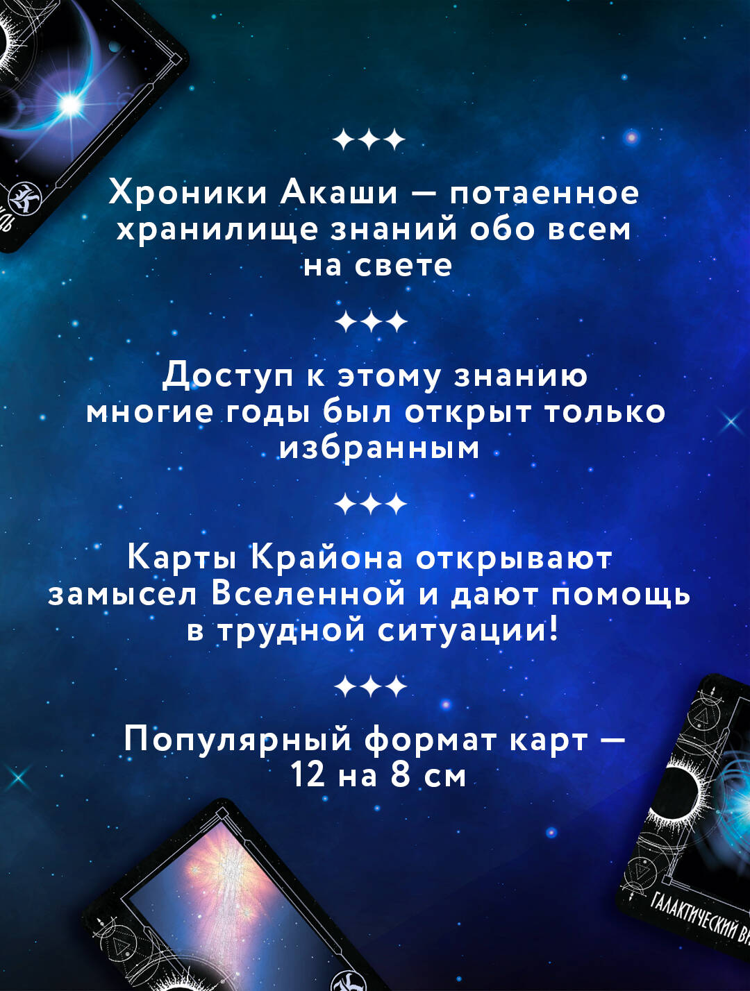 Таро Хроник Акаши - чудесный инструмент для управления событиями, пробуждения в вас лучших качеств и получения ответа от Божественного Духа Крайона на любой вопрос. Хроники Акаши - «библиотека», в которой хранится информация о прошлом, настоящем и будущем всей Вселенной и каждого из нас. Уникальные карты Хроник Акаши, послания и практики Крайона открывают вам доступ к этой информации и позволяют оказывать влияние на любые события вашей жизни.