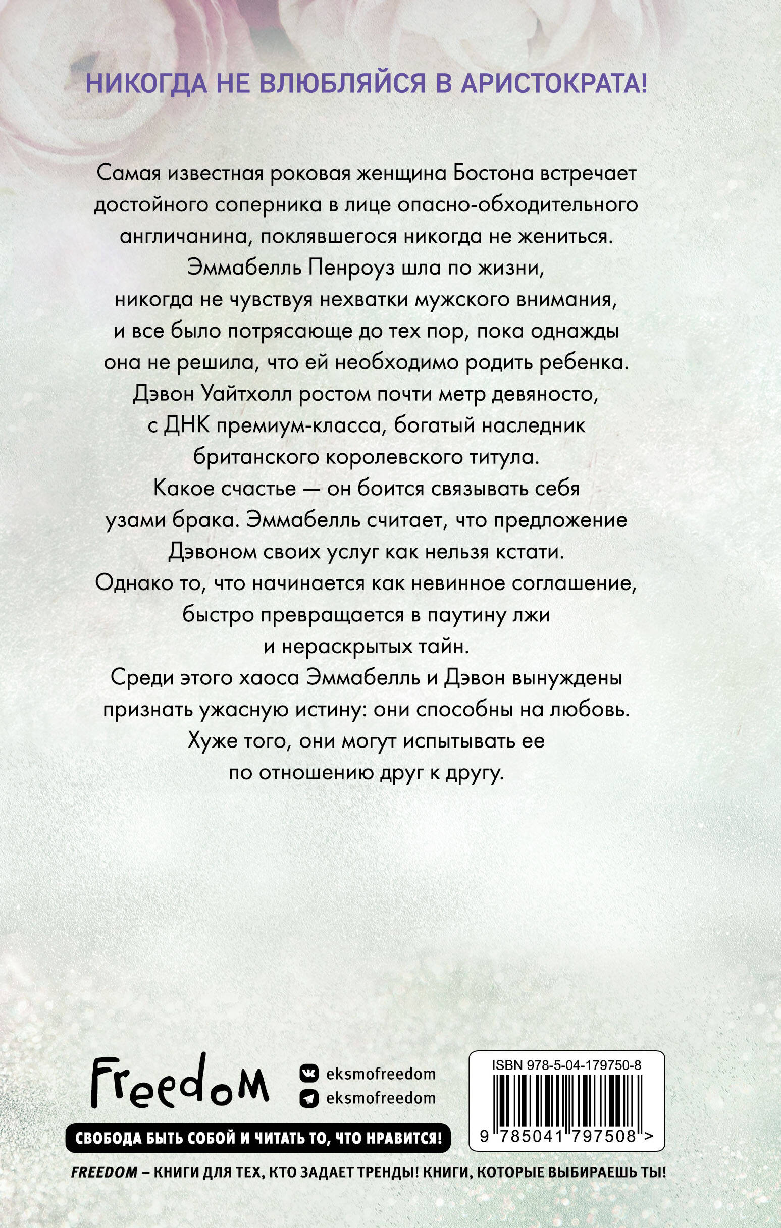 Заключительный роман тетралогии про Красавиц Бостона от автора бестселлеров USA Today, Amazon и Washington Post Л. Дж. Шэн! Драматичная история о непростом выборе между чувствами и принципами и о борьбе с внутренними страхами. Эммабелль Пенроуз шла по жизни, никогда не чувствуя нехватки мужского внимания, и все было потрясающе хорошо до тех пор, пока однажды она не решила, что ей необходимо родить ребенка. Дэвон Уайтхолл, богатый наследник британского королевского титула, боящийся связывать себя узами брака, - идеальный кандидат. Однако то, что начинается как невинное соглашение, быстро превращается в хаос из паутину лжи и нераскрытых тайн, среди которого Эммабелль и Дэвон вынуждены признать ужасную истину: они способны на любовь.| Издательство | ООО "Издательство "Эксмо" |