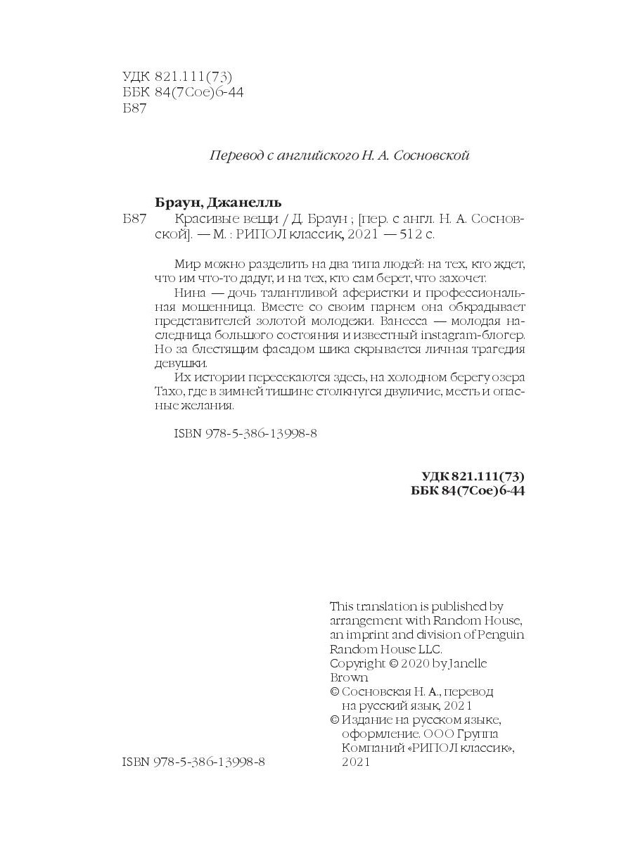 Мир можно разделить на два типа людей: на тех, кто ждет, что им что-то дадут, и на тех, кто сам берет, что захочет. Нина - дочь талантливой аферистки и профессиональная мошенница. Вместе со своим парнем она обкрадывает представителей золотой молодежи. Ванесса - молодая наследница большого состояния и известный instagram-блогер. Но за блестящим фасадом шика скрывается личная трагедия девушки. Их истории пересекаются здесь, на холодном берегу озера Тахо, где в зимней тишине столкнутся двуличие, месть и опасные желания.| Издательство | Рипол Классик |