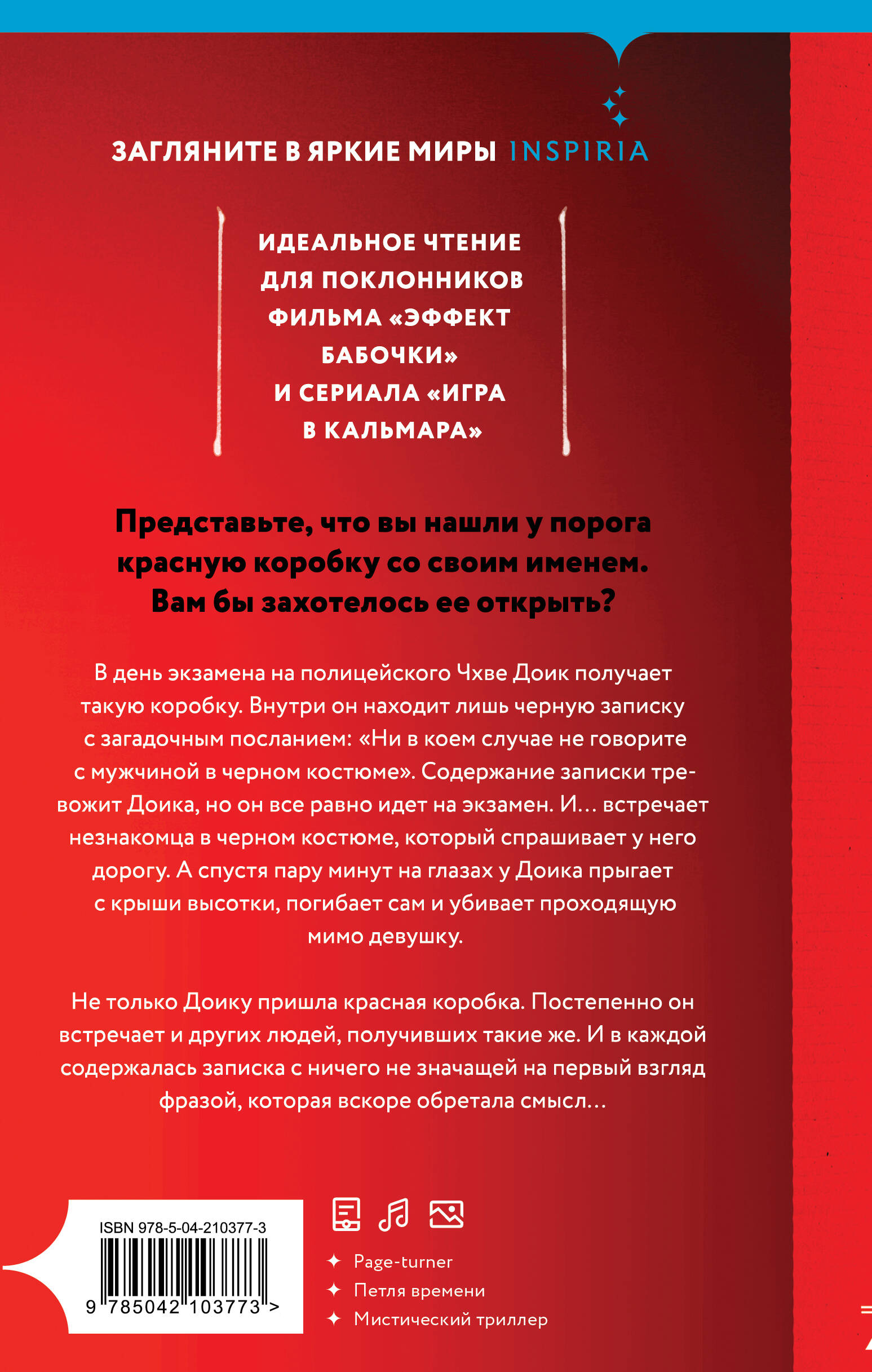 ИДЕАЛЬНОЕ ЧТЕНИЕ ДЛЯ ПОКЛОННИКОВ ФИЛЬМА «ЭФФЕКТ БАБОЧКИ» И СЕРИАЛА «ИГРА В КАЛЬМАРА». Представьте, что вы нашли у порога красную коробку со своим именем. Вам бы захотелось её открыть? В день экзамена на полицейского Чхве Доик получает такую коробку. Внутри он находит лишь черную записку с загадочным посланием: «Ни в коем случае не говорите с мужчиной в черном костюме». Содержание записки тревожит Доика, но он все равно идет на экзамен. И… встречает незнакомца в черном костюме, который спрашивает у него дорогу. А спустя пару минут на глазах у Доика прыгает с крыши высотки, погибает сам и убивает проходящую мимо девушку. Не только Доику пришла красная коробка. Постепенно он встречает и других людей, получивших такие же. И в каждой содержалась записка с ничего не значащей на первый взгляд фразой, которая вскоре обретала смысл… «Республика Корея - "Республика доставки". Мы заказываем все - от продуктов до строительных материалов. Мы живем во времена, когда нет товаров, которые мы не могли бы заказать на дом. Чтобы их доставили прямо до порога. Обнаружив коробку со своим именем у двери, вы, скорее всего, не задумываясь, занесете ее в дом. Но что, если, открыв ее, вы обнаружите внутри только жуткую записку? "Красная коробка" как раз об этом. Вы словно видите отражение себя на страницах этого триллера, и от этого бегут мурашки по коже». - КИМ ЧЖОНЁН, автор «"Красная коробка" - настоящая книга-головоломка, потому что действительно заставляет читателя поломать голову над происходящим. Сюжет этой истории напоминает лабиринт - он полон неожиданных поворотов, стремительно развиваясь и держа читателя в напряжении до самой последней страницы. А финал, безусловно, станет поводом для бурных обсуждений». - МУХОРТОВА КСЕНИЯ, переводчик «Эта книга так и просится на экраны, я не удивлена, что сразу после выхода купили права на экранизацию и решено было сделать адаптацию в виде манги и вебтуна. Динамичная и полная загадок история, от которой сложно оторваться, пока не дочитаешь». - НЕСТЕРОВА ОЛЬГА, редактор| Издательство | ООО "Издательство "Эксмо" |
