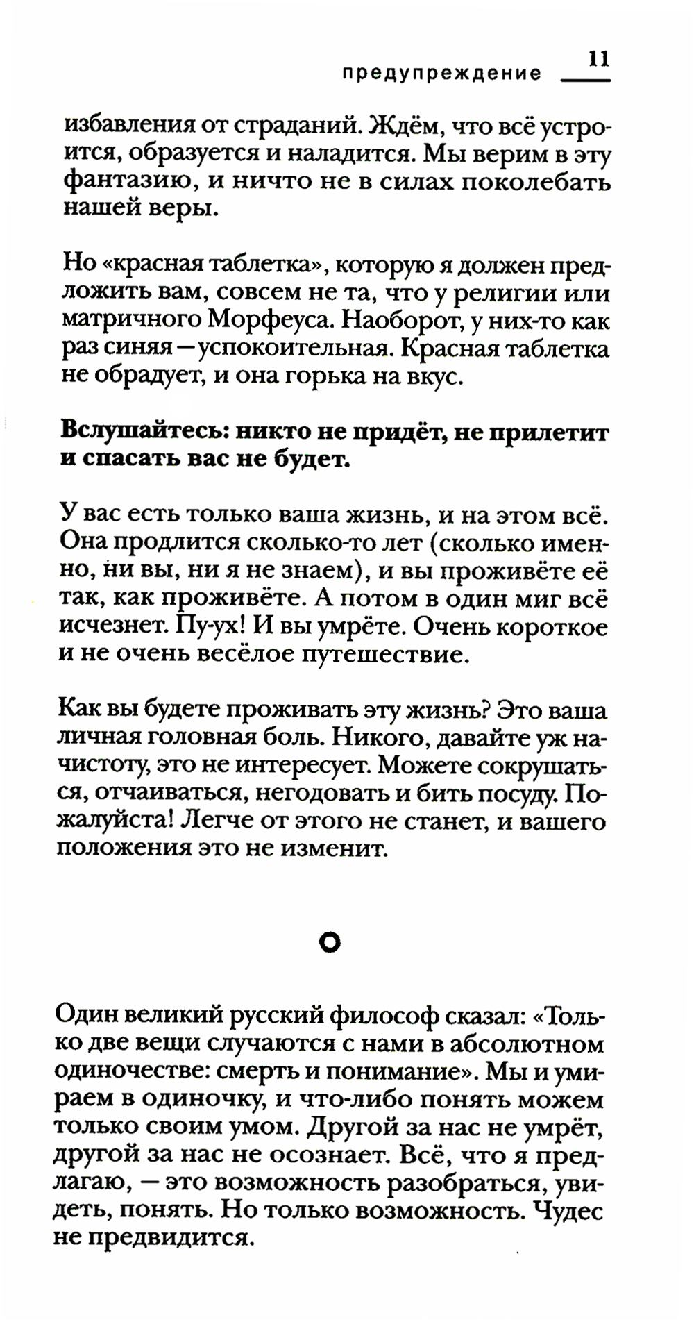 Настоящий мир не таков, каким кажется. Порой мы чувствуем, что живем не своей жизнью. Словно какой-то сбой в Матрице: мучаемся от одиночества, бессмысленности жизни, не понимаем своих истинных желаний. Мы хотим прожить другую - лучшую - жизнь. Но не знаем как. Беда в том, что нам слишком долго рассказывали о счастье, успехе и любви. Никто не предупредил, что радостные чувства мимолетны, успех кажется таковым только со стороны, а всякая страсть заканчивается разочарованием. Такова правда. Кто-то готов выбрать «красную таблетку», а кто-то продолжает травить себя «синей» - иллюзиями и неведением. «Синюю таблетку», кстати, даже выбирать не надо - она дана нам по умолчанию. А вот «красную» нужно и выбрать, и проглотить, и пережить непростой процесс внутреннего изменения. Ответственность, разумеется, на том, кто делает выбор.| Издательство | ИД "Нева" |