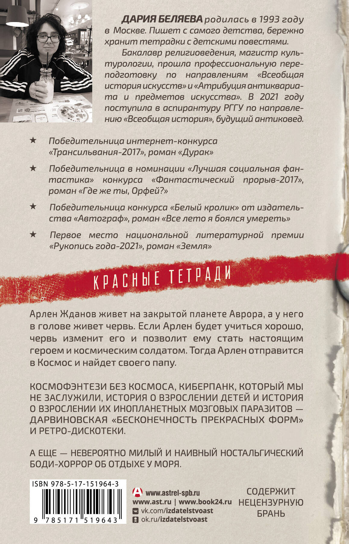 Смелая и оригинальная новинка в жанре социальной фантастики от Дарии Беляевой. Идеалистическая жизнь в курортном городе у моря с играми, поездками на катерах, прогулками по набережной, ритуалами по вызову Пиковой Дамы, первыми влюбленностями, драками и дискотеками чередуется с жестокими экспериментами, которым подвергаются дети. Пионеры проникают в самые темные уголки своего разума, лишаются органов чувств и даже конечностей, и все для того, чтобы пробудить скрытую в себе силу. Паразитические черви, которыми поражены все жители планеты Аврора, пробуждаются, делая Арлена и его друзей чем-то большим, чем люди.| Издательство | ИЗДАТЕЛЬСТВО "АСТ" |