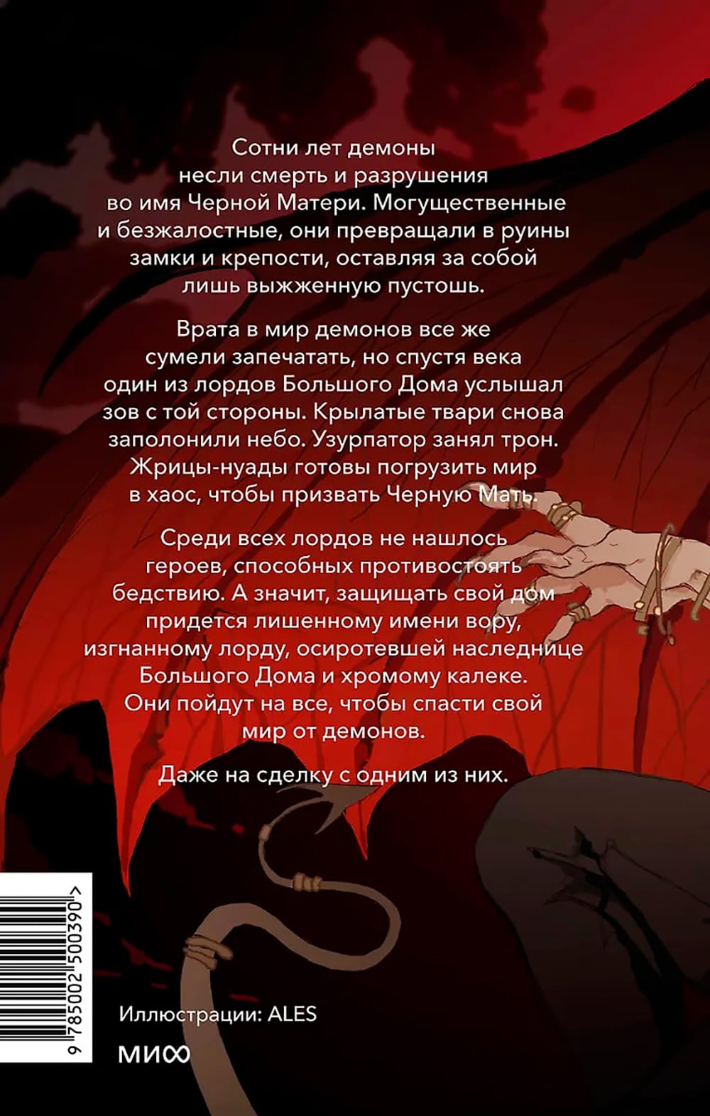 Сотни лет демоны несли смерть и разрушения во имя Черной Матери. Могущественные и безжалостные, они превращали в руины замки и крепости, оставляя за собой лишь выжженную пустошь. Врата в мир демонов все же сумели запечатать, но спустя века один из лордов Большого Дома услышал зов с той стороны. Крылатые твари снова заполонили небо. Узурпатор занял трон. Жрицы-нуады готовы погрузить мир в хаос, чтобы призвать Черную Мать. Среди всех лордов не нашлось героев, способных противостоять бедствию. А значит, защищать свой дом придется лишенному имени вору, изгнанному лорду, осиротевшей наследнице Большого Дома и хромому калеке. Они пойдут на все, чтобы спасти свой мир от демонов. Даже на сделку с одним из них.