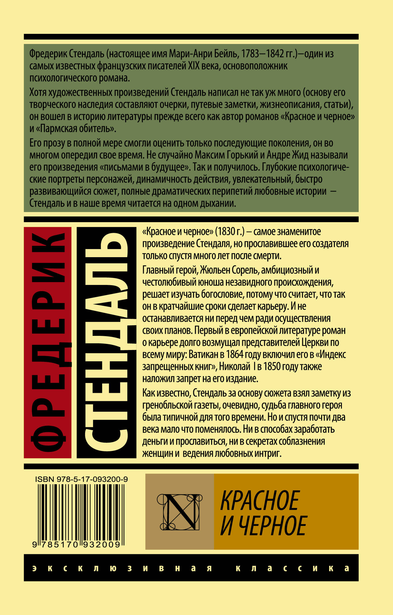 "Красное и черное" (1830 г.) - самое знаменитое произведение Стендаля, но прославившее его создателя только спустя много лет после смерти. Главный герой, Жюльен Сорель, амбициозный и честолюбивый юноша незавидного происхождения, решает изучать богословие, потому что считает, что так он в кратчайшие сроки сделает карьеру. И не останавливается ни перед чем ради осуществления своих планов. Первый в европейской литературе роман о карьере долго возмущал представителей Церкви по всему миру: Ватикан в 1864 году включил его в "Индекс запрещенных книг", Николай I в 1850 году также наложил запрет на его издание. Как известно, Стендаль за основу сюжета взял заметку из гренобльской газеты, очевидно, судьба главного героя была типичной для того времени. Но и спустя почти два века мало что поменялось. Ни в способах заработать деньги и прославиться, ни в секретах соблазнения женщин и ведения любовных интриг.| Издательство | ИЗДАТЕЛЬСТВО "АСТ" |