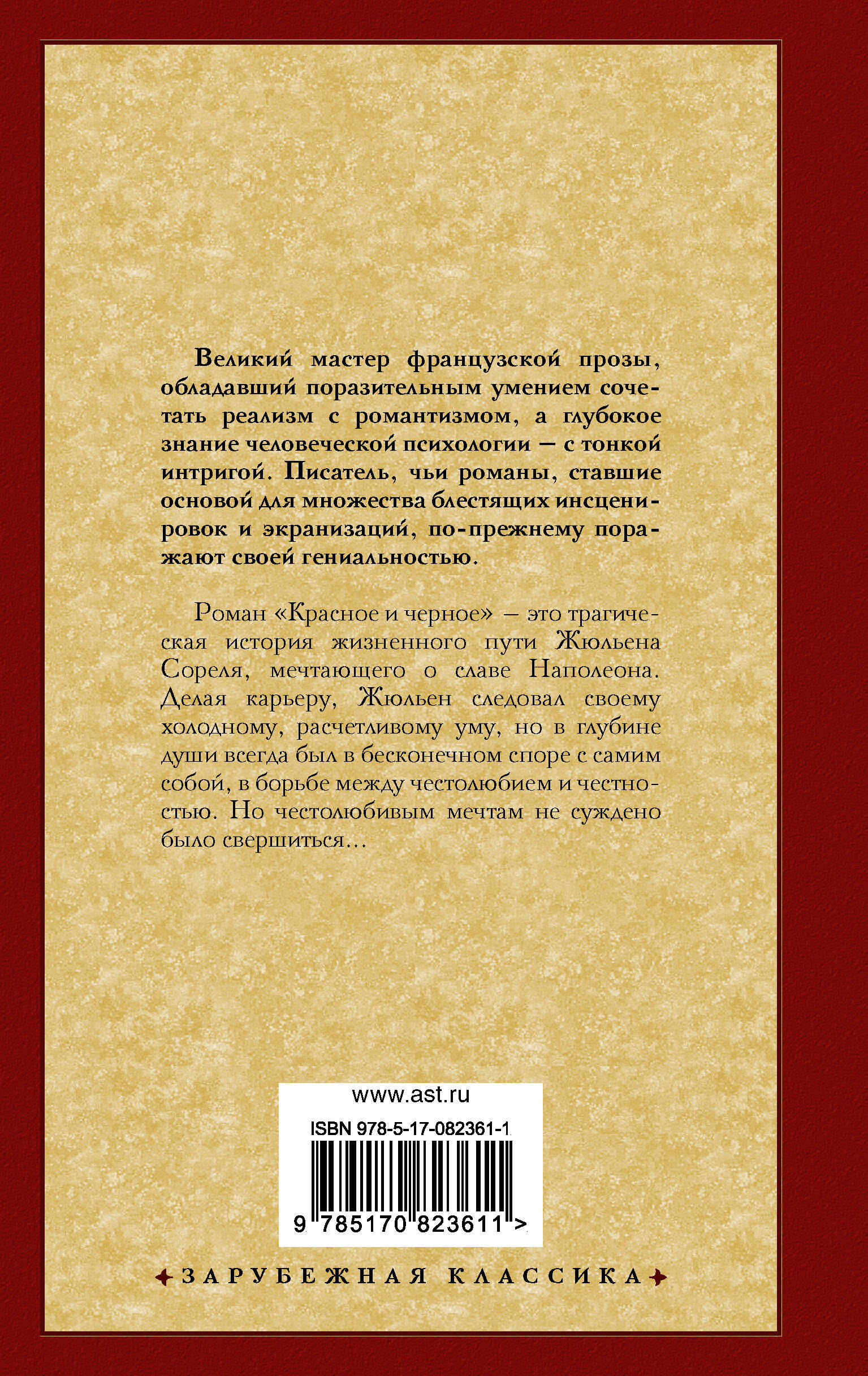 Роман "Красное и черное" - это трагическая история жизненного пути Жюльена Сореля, мечтающего о славе Наполеона. Делая карьеру, Жюльен следовал своему холодному, расчетливому уму, но в глубине души всегда был в бесконечном споре с самим собой, в борьбе между честолюбием и честью. Но честолюбивым мечтам не суждено было свершиться...| Издательство | ИЗДАТЕЛЬСТВО "АСТ" |
