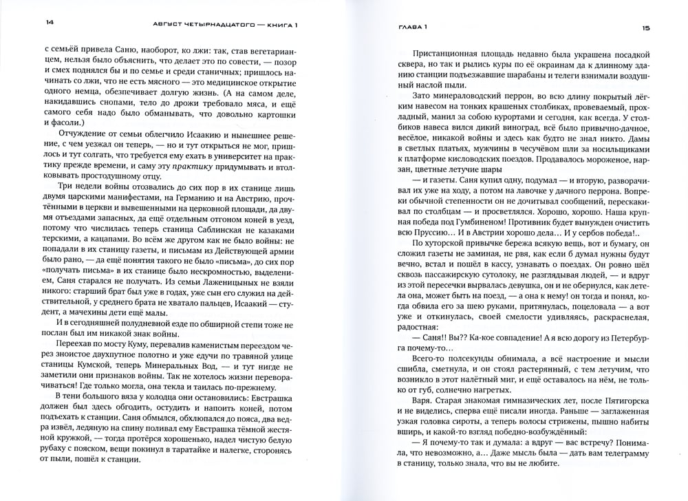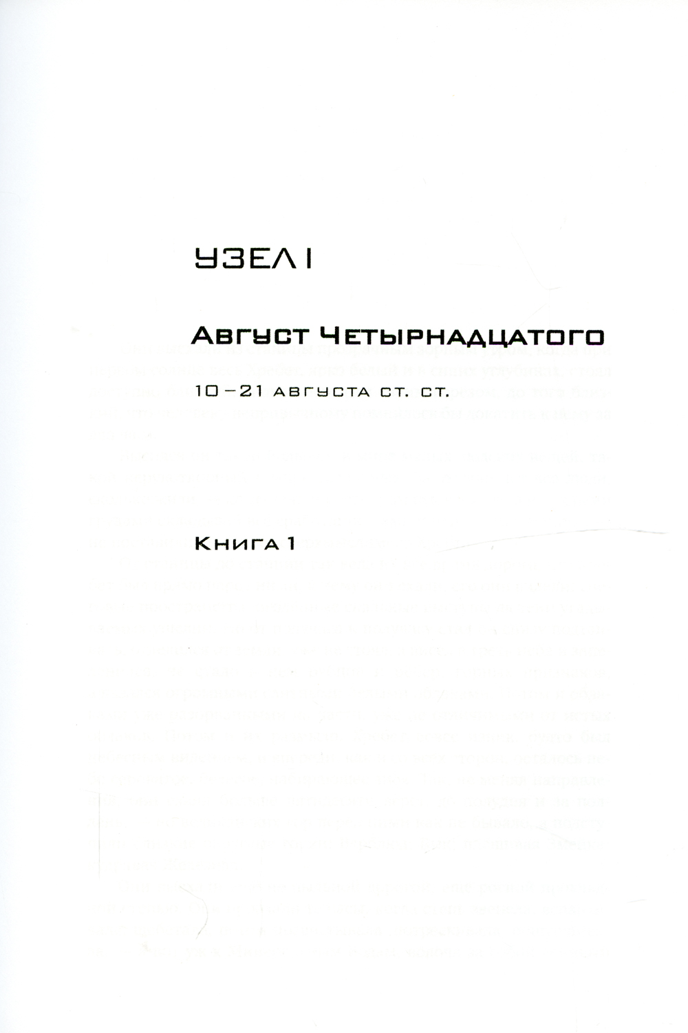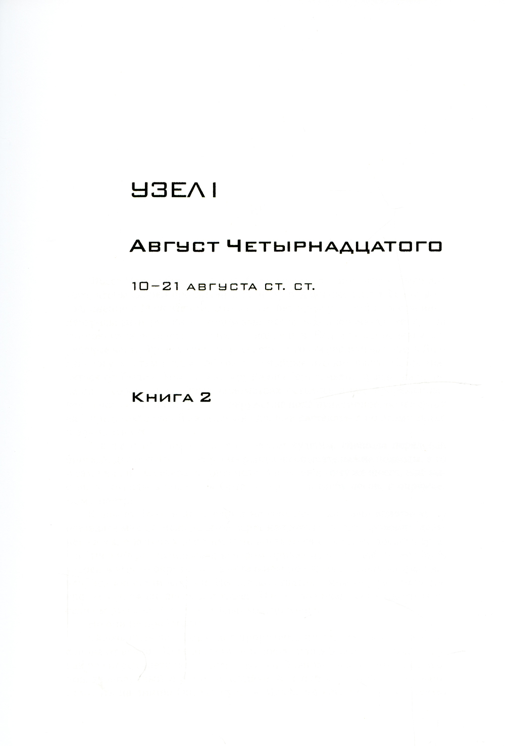 Первый том открывает историческую эпопею в четырех Узлах «Красное Колесо». Узел I, «Август Четырнадцатого», состоит из двух книг. Книга первая посвящена самсоновской катастрофе - окружению и разгрому Второй русской армии в начале Первой мировой войны. Второй том содержит окончание «Августа Четырнадцатого» - первого Узла исторической эпопеи «Красное Колесо». В нём не только завершён показ и анализ Самсоновской катастрофы, но дан художественный обзор царствования последнего императора Николая Второго вплоть до Первой мировой войны и ярко представлена фигура премьер-министра П. А. Столыпина, его труды, реформы и трагическая смерть.| Издательство | Время |