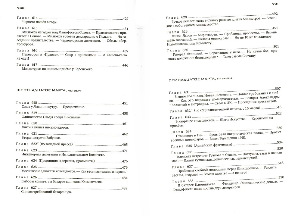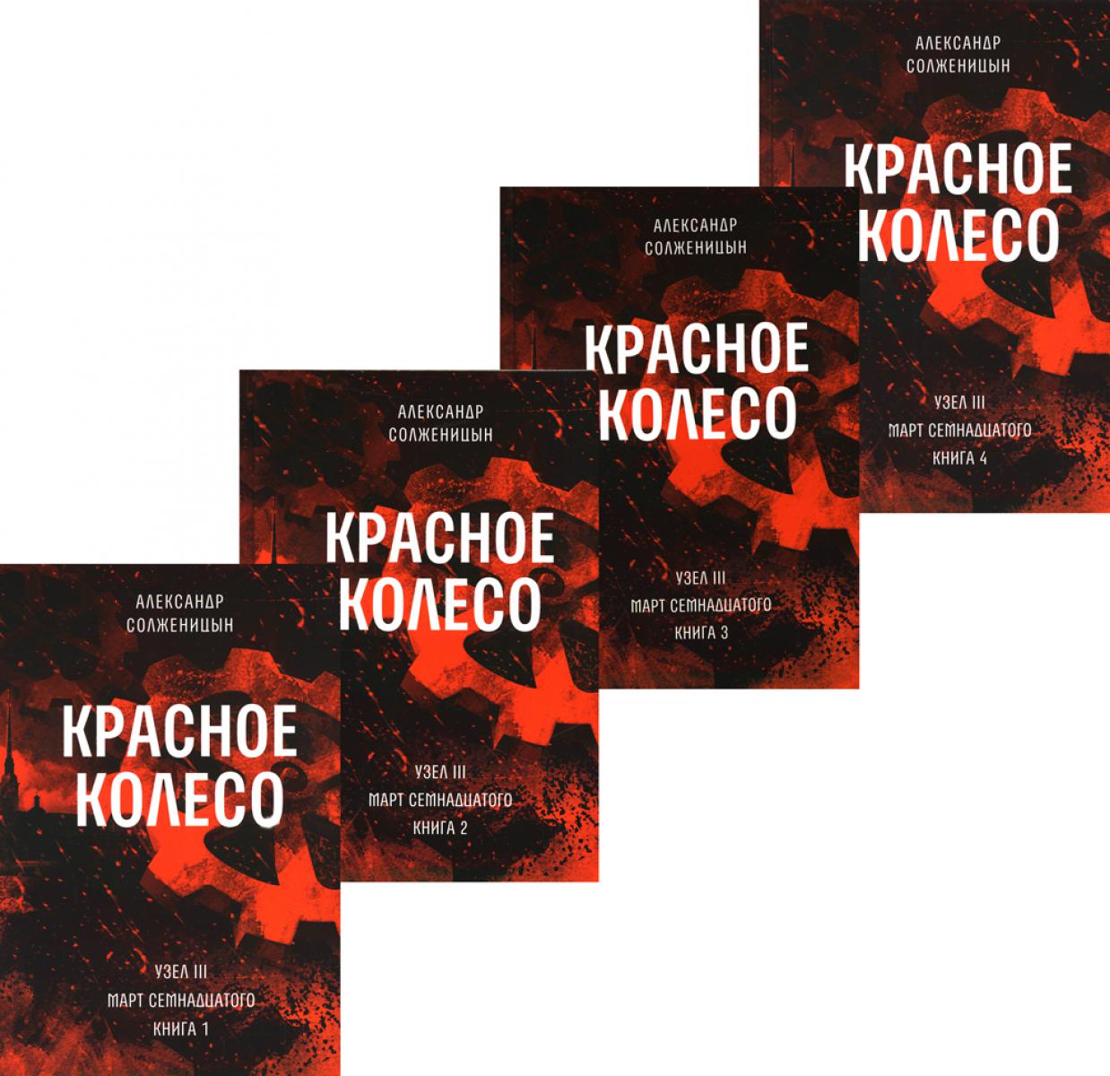 В комплекте представлены следующие книги А. И. Солженицына: "Красное колесо: Повествованье в отмеренных сроках. Узел III: Март Семнадцатого. Книга 1" В первой книге «Марта Семнадцатого» описаны начальные дни Февральской революции в Петрограде: последние прения в Государственной Думе; разгон уличных демонстраций, стрельба; бунт запасных батальонов; растерянность Совета министров; Ленин в Цюрихе; Государь в Могилёве. Первые аресты чиновных лиц в Петрограде. "Красное колесо: Повествованье в отмеренных сроках. Узел III: Март Семнадцатого. Книга 2" Во второй книге «Марта Семнадцатого» читатель погружается в бурные события второй недели Февральской революции, весть о которой облетела всю Россию через телеграф министерства путей сообщения. Ставка шлёт полки против Петрограда. А у Таврического дворца победные речи. Одновременное формирование двух новых властей: Временного Правительства и Исполнительного Комитета Совета Рабочих Депутатов. Государь спешит из Ставки в Царское Село, к семье. Исполком рассылает разрушительный для Армии «Приказ № 1». Ставка отзывает полки, посланные на подавление. Отречение Николая II. Царских министров - в Петропавловскую крепость. "Красное колесо: Повествованье в отмеренных сроках. Узел III: Март Семнадцатого. Книга 3" Конец династии? Великий князь Михаил не принял престола от своего отрекшегося брата. Читатель следит, как революция утверждается в Петрограде, Москве; как она приходит в Ростов, на Дон, на Тамбовщину. Повсюду распад властей. Действующую Армию сотряс разосланный Исполкомом «Приказ № 1». Во множестве воинских частей, фронтовых и тыловых, - развал и произвол. Офицерство подорвано необратимо. Бунт на кораблях Балтийского флота; убийство адмирала Непенина. Арест Государя в Ставке, в Могилёве. Заточение его с семьёй в Царском Селе. "Красное колесо: Повествованье в отмеренных сроках. Узел III: Март Семнадцатого. Книга 4" От имени Петроградского Совета рабочих и солдатских депутатов в Европу послан интернационалистский Манифест «К народам мира». Революция разливается по стране, автор показывает нам фронт, деревню, железные дороги, Церковь, донских казаков, волжское купечество и возвращается каждый раз в Петроград, где читатель наблюдает, как самозваный Исполком фактически контролирует и направляет Временное правительство. В редакции «Правды» - разногласия верного ленинского последователя Шляпникова и прибывшего из сибирской ссылки Каменева (свергать Временное правительство или поддерживать?). Ленин из Цюриха сговаривается через германского посла о своём безпрепятственном проезде с группой единомышленников через воюющую Германию - в Россию.