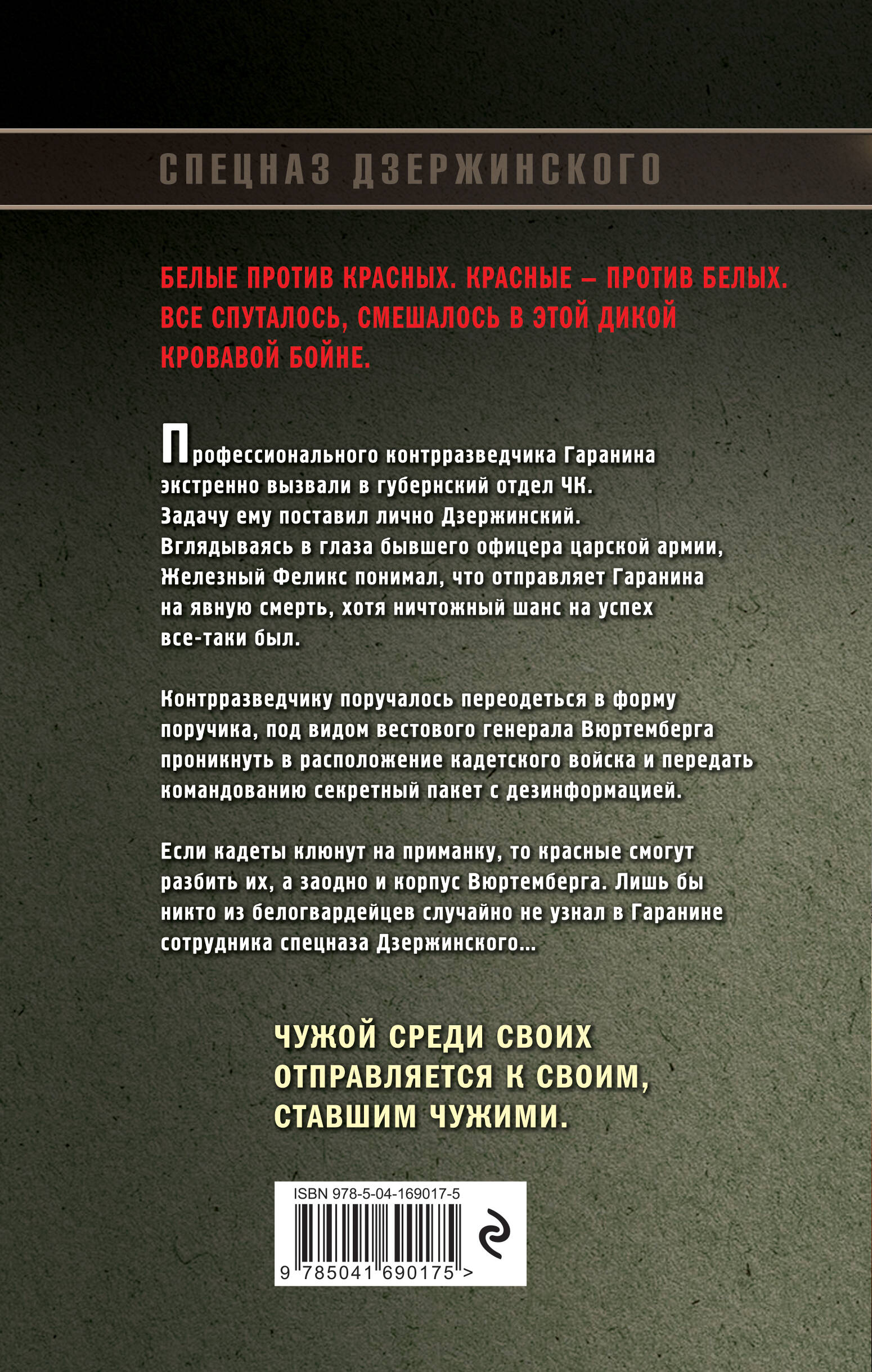 Белые против красных. Красные - против белых. Всё спуталось, смешалось в этой дикой кровавой бойне. Профессионального контрразведчика Гаранина экстренно вызвали в губернский отдел ЧК. Задачу ему ставил лично Дзержинский. Вглядываясь в глаза бывшего офицера царской армии, Железный Феликс понимал, что отправляет Гаранина на явную смерть, хотя ничтожный шанс на успех все-таки был. Контрразведчику поручалось переодеться в форму поручика, под видом вестового генерала Вюртемберга проникнуть в расположение кадетского войска и передать командованию «секретный пакет» с дезинформацией. Если кадеты клюнут на приманку, то красные смогут разбить их, а заодно и корпус Вюртемберга. Лишь бы никто из белогвардейцев случайно не узнал в Гаранине сотрудника спецназа Дзержинского… Чужой среди своих отправляется к своим, ставшими чужими.| Издательство | ООО "Издательство "Эксмо" |