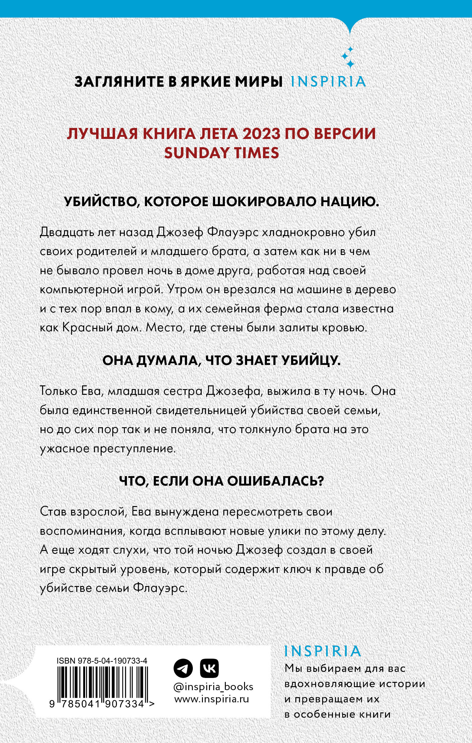 ЛУЧШАЯ КНИГА ЛЕТА 2023 ПО ВЕРСИИ SUNDAY TIMES. Она видела все, что случилось в ту ночь… Но знает ли она правду? Убийство, которое шокировало нацию. Двадцать лет назад Джозеф Флауэрс хладнокровно убил своих родителей и младшего брата, а затем как ни в чем не бывало провел ночь в доме друга, работая над своей компьютерной игрой. Утром он врезался на машине в дерево и с тех пор впал в кому, а их семейная ферма стала известна как Красный дом. Место, где стены были залиты кровью. Она думала, что знает убийцу. Только Ева, младшая сестра Джозефа, выжила в ту ночь. Она была единственной свидетельницей убийства своей семьи, но до сих пор так и не поняла, что толкнуло брата на это ужасное преступление. Что, если она ошибалась? Став взрослой, Ева вынуждена пересмотреть свои воспоминания, когда всплывают новые улики по этому делу. А еще ходят слухи, что той ночью Джозеф создал в своей игре скрытый уровень, который содержит ключ к правде об убийстве семьи Флауэрс. «Одна из лучших современных писательниц детективного жанра». - ЭЛЛИ ГРИФФИТС «Очередное подтверждение, что Уоткинс - одна из лучших британских писательниц детективного жанра». - DAILY MAIL «Уоткинс отлично справляется со сложными сюжетами». - САРА ЛИНЛИ «Искусно написанный, изобилующий поворотами, захватывающий и тревожный роман». - Б.А. ПЭРИС «"Красный дом" поразил меня с самой первой страницы! Прекрасно написано, с идеальным чувством темпа. Я думала, что хорошо умею находить подсказки, но я была сбита с толку этой удивительно хитроумной загадкой. Мне это очень понравилось!» - АМАНДА БРИТТАНИ, автор книги I'M WATCHING YOU «Я не могла оторваться от этой истории… Я буквально промчалась по Красному дому, я так отчаянно хотела узнать настоящую историю убийства семьи Евы - настоящий page-turner с блестящим финальным твистом». - ЛИЗА ХОЛЛ, автор книги THE WOMAN IN THE WOODS «Роз Уоткинс пишет книги, настолько наполненные атмосферой, что вам приходится постоянно проверять, что в безопасности дома, читаете, а не переживаете в реальности каждый мрачный момент вместе с героями». - СИ. ЭС. ГРИН, автор THE WISPER HOUSE
