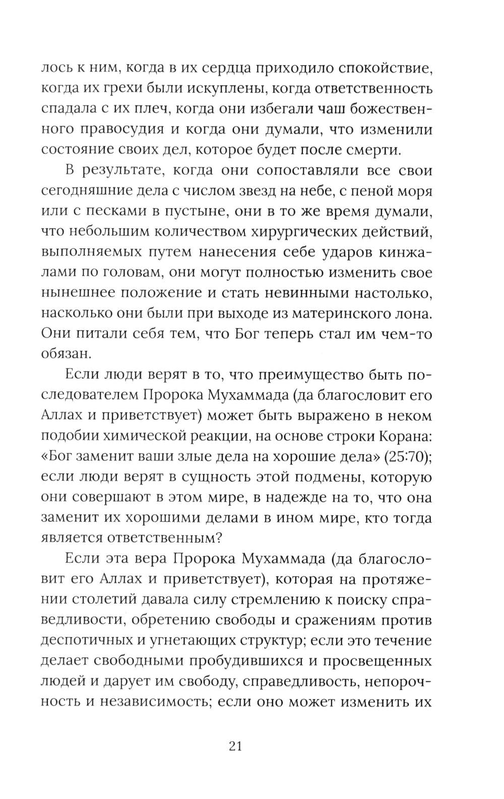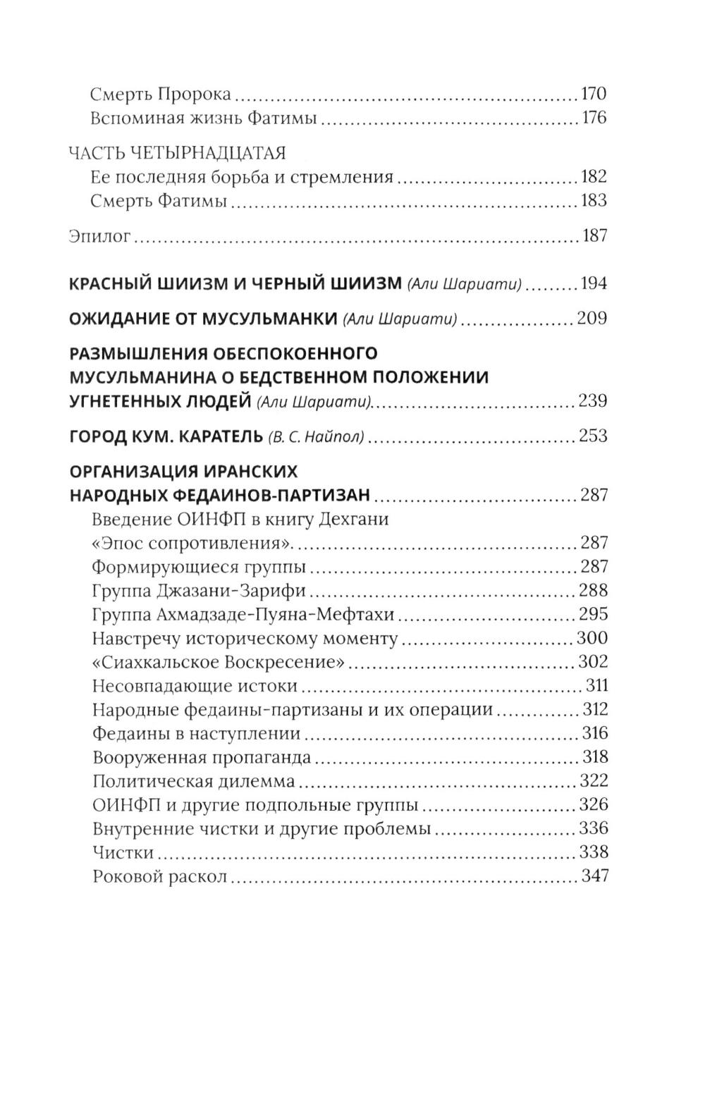 Выдающийся деятель Исламской революции в Иране, Али Шариати умело соединяет шиизм и социализм. Его идеи заложили основу исламской «теологии освобождения» и оказали ключевое влияние на палестинское освободительное движение и социальную политику современного Ирана. Али Шариати боролся за права женщин в Иране, показав корни исламского феминизма в образе Фатимы. В его интерпретации именно образ Фатимы является центральным для всей гуманистической и просвещенческой традиции в исламе. Также в книге представлена история левых партизан Ирана («фидаинов»), боровшихся против шахского режима и позднее вместе с шиитским духовенством выступивших против шаха, против американского и израильского империализма. В значительной мере фидаины опирались на идеи Али Шариати.| Издательство | Родина |