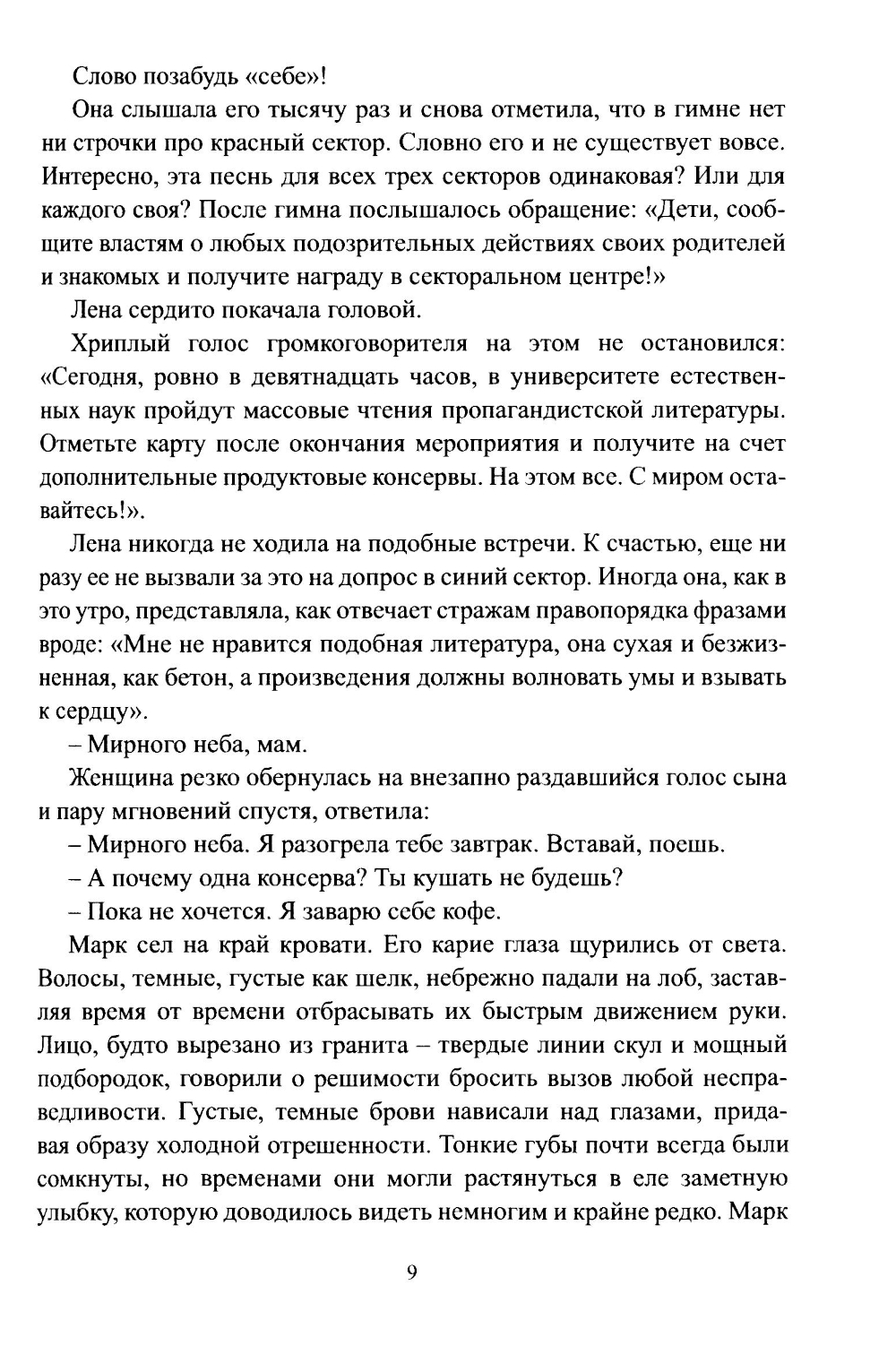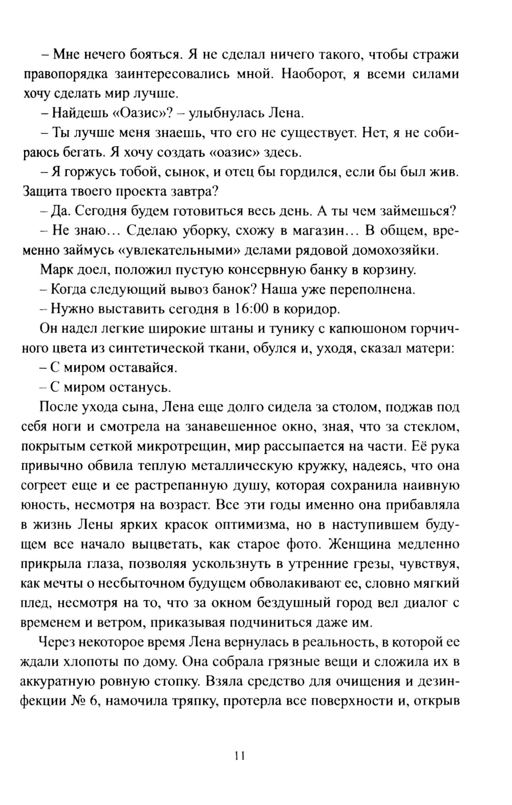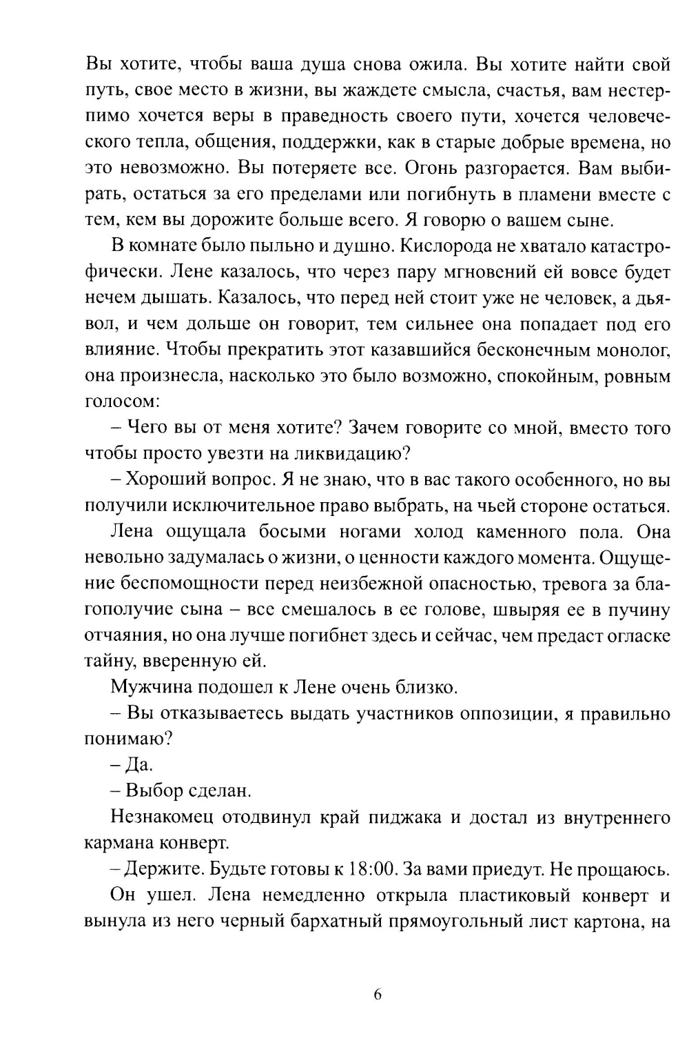 Действие романа переносит нас в фантастический мир будущего. Но в нем нет места для всеобщего процветания. Напротив, это поле жесткой борьбы за свободу, совесть и человечность. Огонь мировой войны изничтожил почти все живое, но только не сердце главной героини Лены Комиссаровой, душа которой стремится к вере, милосердию и лучшему будущему. Человечество находится под гнетом жесточайшей диктатуры, люди боятся не только говорить, но и думать. Лена интуитивно пытается противостоять этому. Но иначе настроен ее юный сын Марк. В поисках лучшего будущего он отправляется к сильным мира сего, идет на сделку с совестью… Но, стремясь к респектабельной жизни, он сталкивается с препятствием - встречает прекрасную юную Сашу, дочь борца сопротивления. Лена в смятении: она не знает, что выберет сын - любовь или власть, совесть или богатство, рабство или свободу.| Издательство | Рипол Классик |
