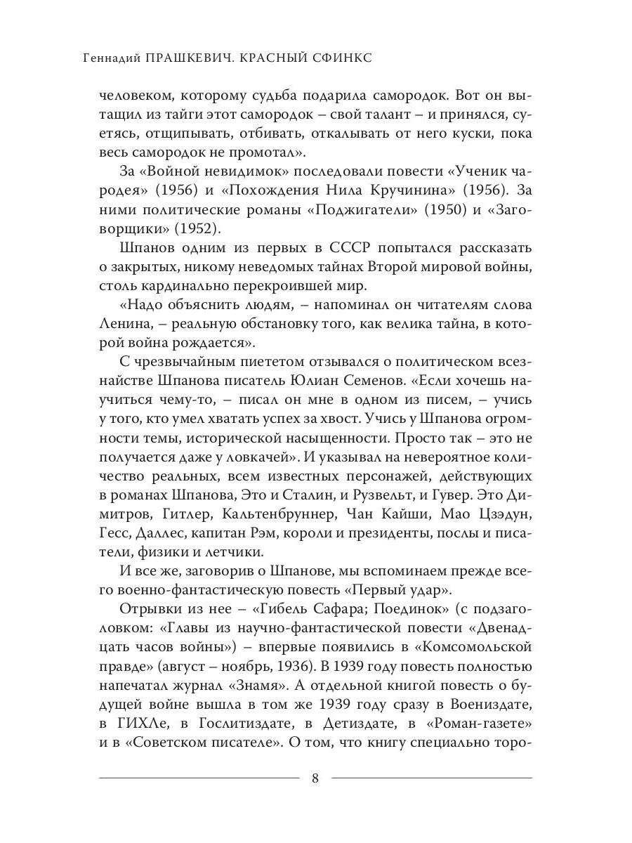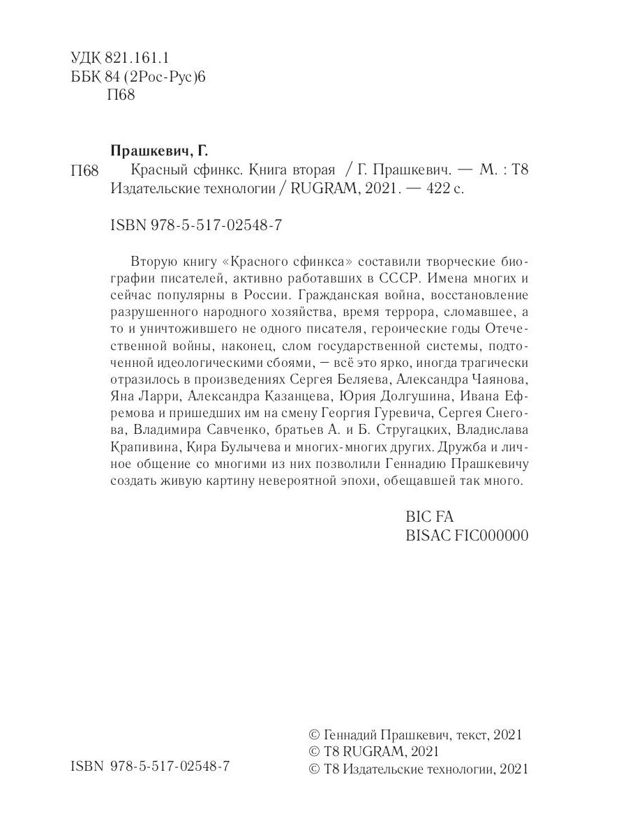 Вторую книгу «Красного сфинкса» составили творческие биографии писателей, активно работавших в СССР. Имена многих и сейчас популярны в России. Гражданская война, восстановление разрушенного народного хозяйства, время террора, сломавшее, а то и уничтожившего не одного писателя, героические годы Отечественной войны, наконец, слом государственной системы, подточенной идеологическими сбоями, - всё это ярко, иногда трагически отразилось в произведениях Сергея Беляева, Александра Чаянова, Яна Ларри, Александра Казанцева, Юрия Долгушина, Ивана Ефремова и пришедших им на смену Георгия Гуревича, Сергея Снегова, Владимира Савченко, братьев А. и Б. Стругацких, Владислава Крапивина, Кира Булычева и многих-многих других. Дружба и личное общение со многими из них позволили Геннадию Прашкевичу создать живую картину невероятной эпохи, обещавшей так много.| Издательство | Т8 RUGRAM |