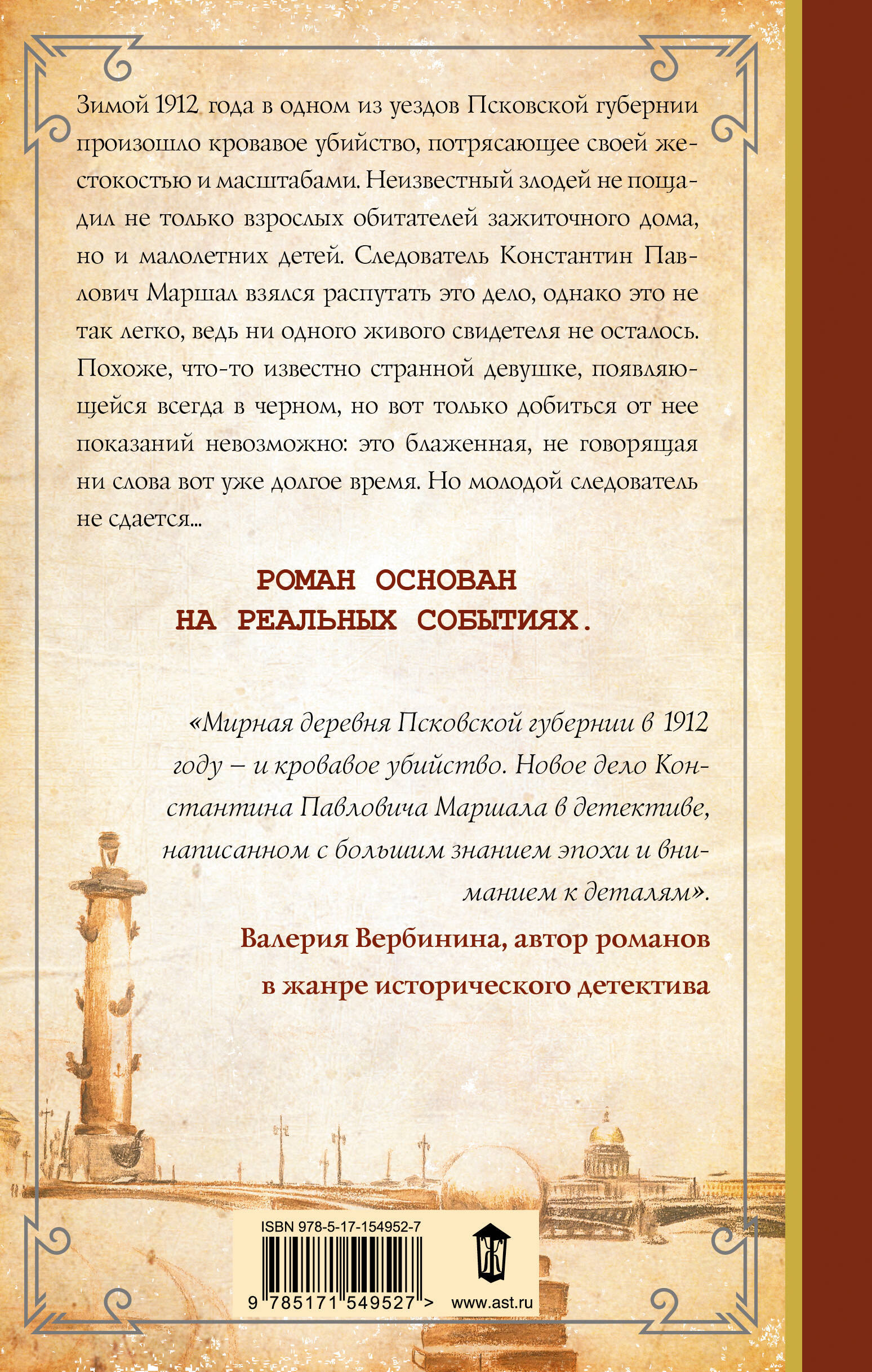 Зимой 1912 года в одном из уездов Псковской губернии произошло кровавое убийство, потрясающее своей жестокостью и масштабами. Неизвестный злодей не пощадил не только взрослых обитателей зажиточного дома, но и малолетних детей. Следователь Константин Павлович Маршал взялся распутать это дело, однако это не так легко, ведь ни одного живого свидетеля не осталось. Похоже, что-то известно странной девушке, появляющейся всегда в черном, но вот только добиться от нее показаний невозможно: это блаженная, не говорящая ни слова вот уже долгое время. Но молодой следователь не сдается... Роман основан на реальных событиях.| Издательство | ИЗДАТЕЛЬСТВО "АСТ" |