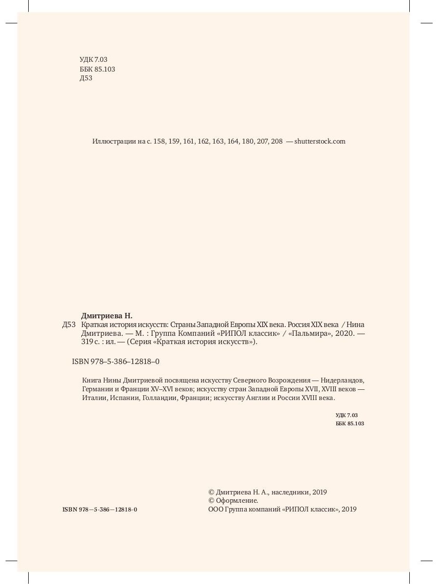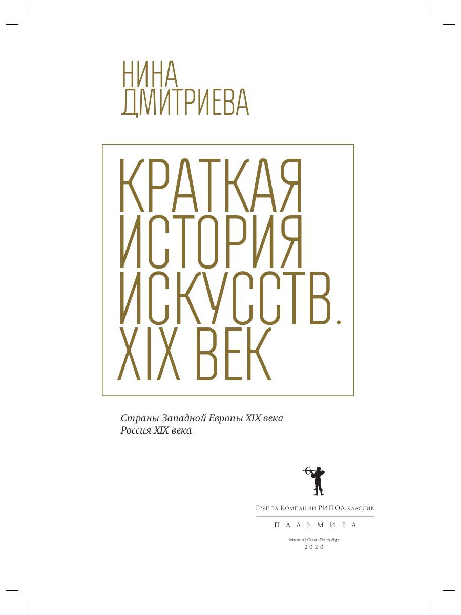 В своем легендарном труде «Краткая история искусств: XIX век» Нина Дмитриева рассказывает об искусстве Франции и других стран Европы, а именно эпохах романтизма, реализма, символизма и модерна, а также о русском искусстве этого периода.| Издательство | Рипол Классик |