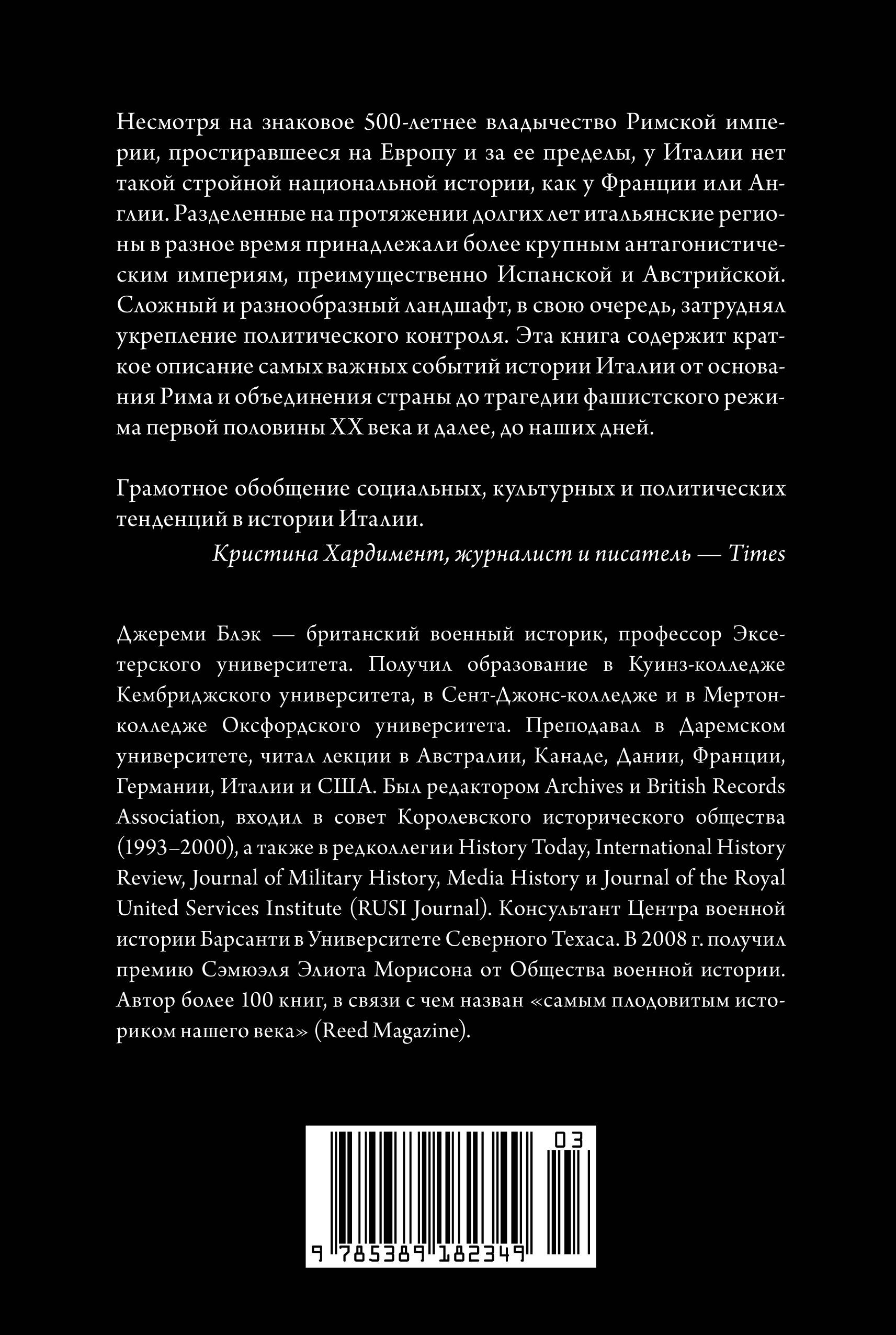 Родина Возрождения и стиля барокко, Италия всегда была центром культуры. В современной Италии сильна гордость за культурную самобытность, которой отличаются Тоскана, Рим, Сицилия, Венеция и другие регионы. Обобщая самые важные события истории Италии от основания Рима и объединения страны до реалий фашистского режима в первой половине XX века и далее, до наших дней, авторитетный британский историк Джереми Блэк исследует истоки культурного влияния итальянцев на весь мир, а также причины и следствия политических событий и разделения, которое все еще существует сегодня. "Эта книга незаменима для тех, кто собирается посетить Италию и при этом хочет узнать о ней больше того, что обычно можно прочитать в лаконичных путеводителях. На протяжении долгих столетий Италия была раздроблена и многие ее части принадлежали крупным, соперничающим друг с другом державам - Австрийской и Испанской империям. Поэтому у нее нет единой многовековой истории, как у других стран (например, Франции), и написание краткой истории Италии дело непростое. В мой рассказ включены как основополагающие события в хронологическом порядке, так и сведения об отдельных регионах". (Джереми Блэк)| Издательство | Азбука-Аттикус Издат.группа ООО |