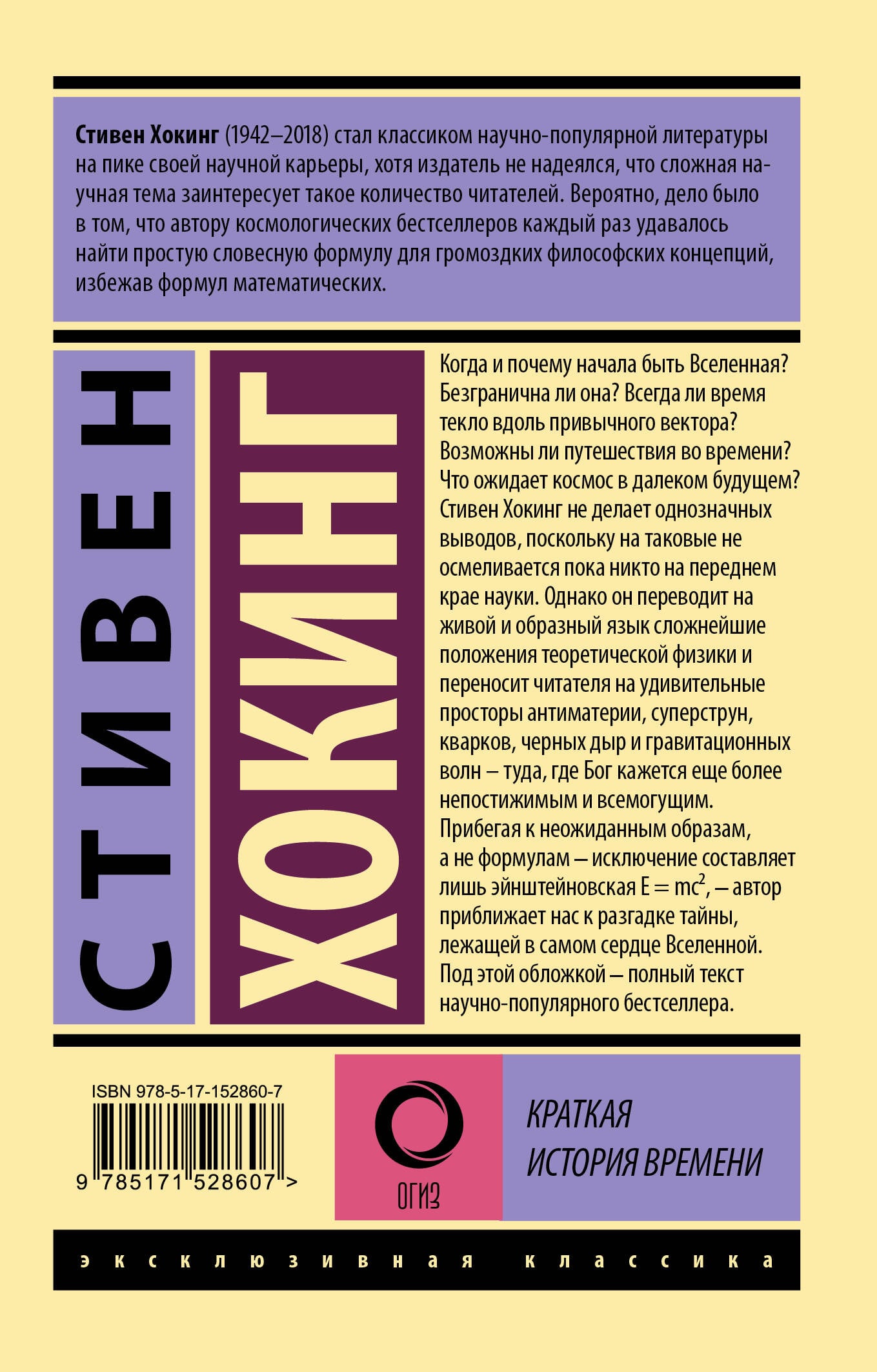 "Краткая история времени" Стивена Хокинга - один из столпов современной научно-популярной литературы. В этой книге автор пытается ответить на самые сложные и интригующие вопросы о мироздании: когда и почему началась Вселенная? безгранична ли Вселенная или у нее есть предел? всегда ли время текло вдоль привычного для нас вектора? возможны ли путешествия во времени? что ожидает космос в далеком будущем? Стивен Хокинг не делает однозначных выводов, поскольку на таковые не осмеливается пока никто на переднем крае науки. Однако он переводит на живой и образный язык сложнейшие положения теоретической физики и переносит читателя на удивительные просторы антиматерии, суперструн, кварков, черных дыр и гравитационных волн - туда, где Бог кажется еще более непостижимым и всемогущим. Прибегая к неожиданным образам, а не формулам - исключение составляет лишь эйнштейновская Е = mc2, - Стивен Хокинг приближает нас к разгадке тайны, лежащей в самом сердце Вселенной. Под этой обложкой - полный текст научно-популярного бестселлера. Текст сопровождают примечания и уточнения, сообщающие о достижениях современных космологов и астрономов.| Издательство | ИЗДАТЕЛЬСТВО "АСТ" |