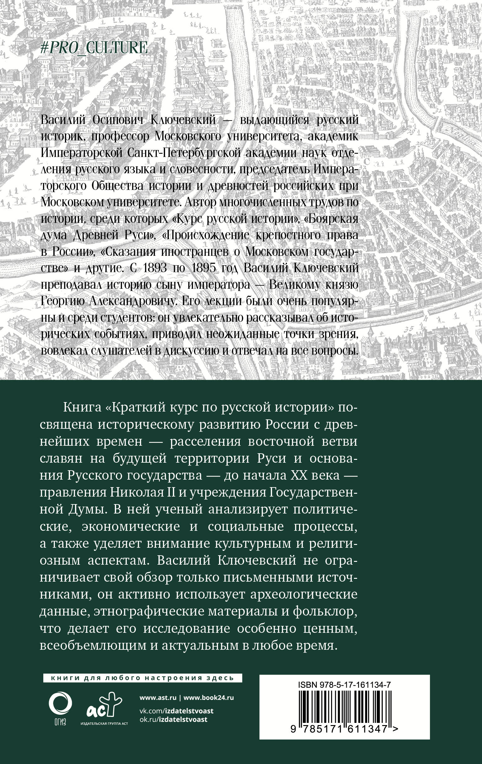 Книга "Краткий курс по русской истории" посвящена историческому развитию России с древнейших времен - расселения восточной ветви славян на будущей территории Руси и основания Русского государства - до начала XX века - правления Николая II и учреждения Государственной Думы. В ней ученый анализирует политические, экономические и социальные процессы, а также уделяет внимание культурным и религиозным аспектам. Василий Ключевский не ограничивает свой обзор только письменными источниками, он активно использует археологические данные, этнографические материалы и фольклор, что делает его исследование особенно ценным, всеобъемлющим и актуальным в любое время.| Издательство | Издательство "АСТ" |