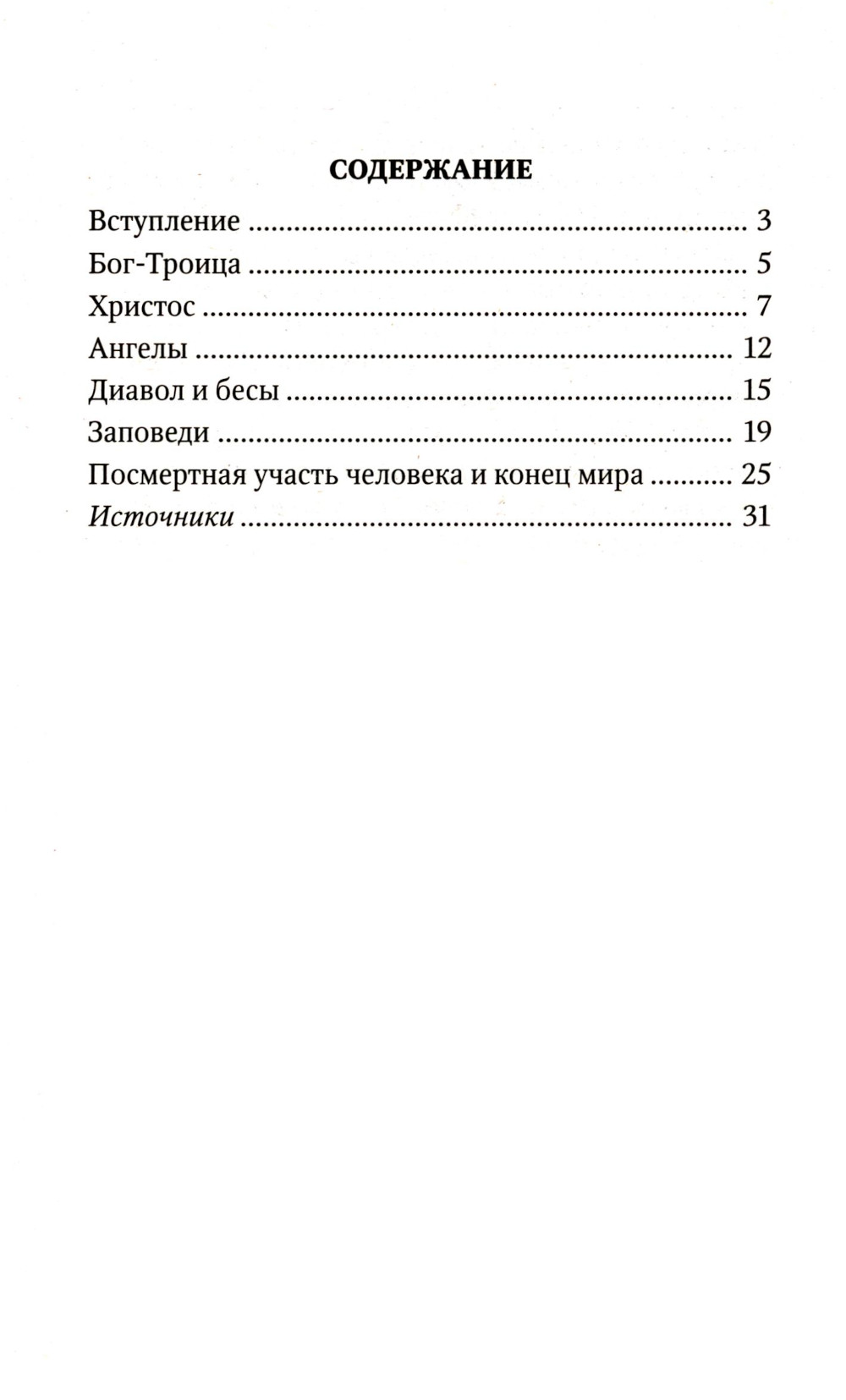 В брошюре кратко и простым языком рассказывается о Боге-Троице, о Христе, об ангелах и бесах, о пути ко спасению, о посмертной участи человека и конце мира. Книжечка рассчитана, в первую очередь, на людей воцерковляющихся, только начавших свой путь ко Христу, а тем, кто уже годами живет церковной жизнью, она, возможно, напомнит основные вероучительные истины Православия.| Издательство | Скрижаль |