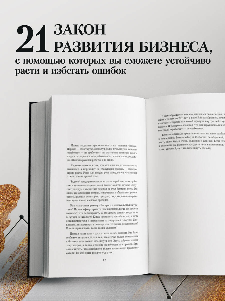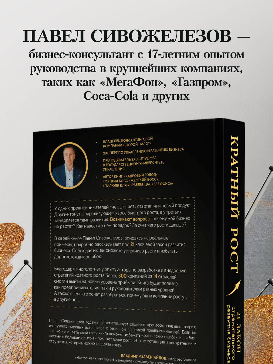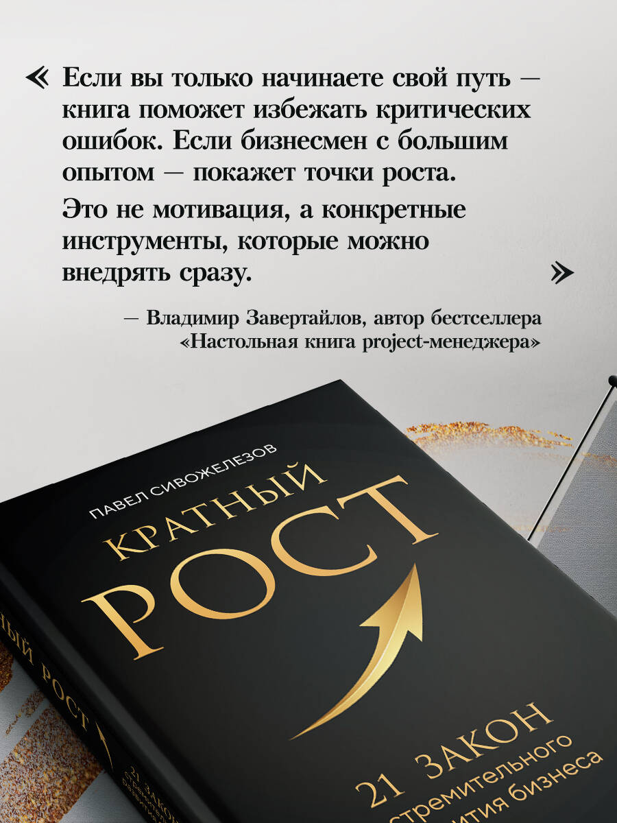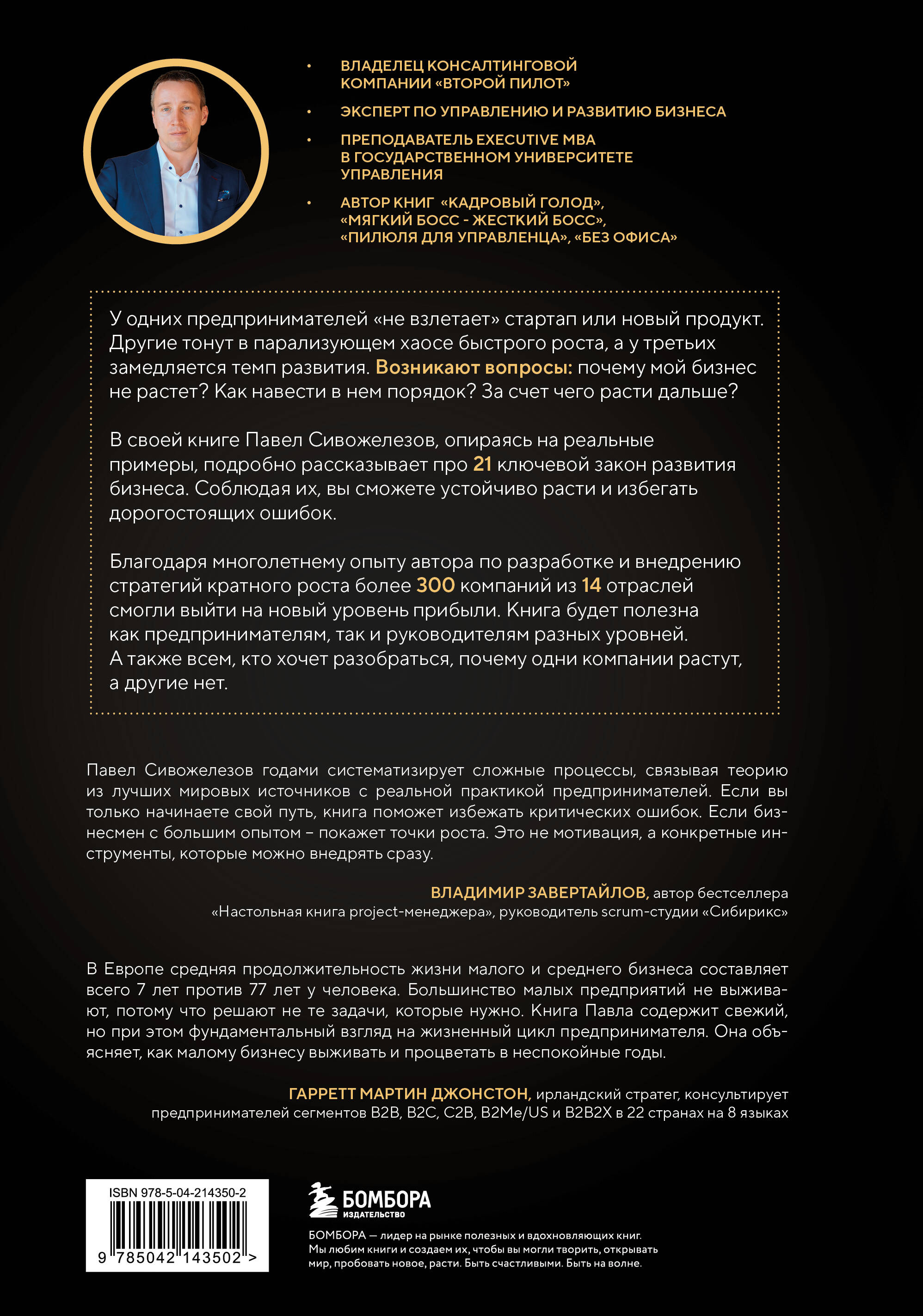 У одних предпринимателей «не взлетает» стартап или новый продукт. Другие тонут в парализующем хаосе быстрого роста, а у третьих замедляется темп развития. Возникают вопросы: почему мой бизнес не растет? Как навести в нем порядок? За счет чего расти дальше? В своей книге Павел Сивожелезов, опираясь на реальные примеры, подробно рассказывает про 21 ключевой закон развития бизнеса. Соблюдая их, вы сможете устойчиво расти и избегать дорогостоящих ошибок. Благодаря многолетнему опыту автора по разработке и внедрению стратегий кратного роста более 300 компаний из 14 отраслей смогли выйти на новый уровень прибыли. Книга будет полезна как предпринимателям, так и руководителям разных уровней. А также всем, кто хочет разобраться: почему одни компании растут, а другие - нет. «Павел Сивожелезов годами систематизирует сложные процессы, связывая теорию из лучших мировых источников с реальной практикой предпринимателей. Если вы только начинаете свой путь - книга поможет избежать критических ошибок. Если бизнесмен с большим опытом - покажет точки роста. Это не мотивация, а конкретные инструменты, которые можно внедрять сразу». - Владимир Завертайлов, автор бестселлера «Настольная книга project-менеджера», руководитель scrum-студии «Сибирикс» «В Европе средняя продолжительность жизни малого и среднего бизнеса составляет всего семь лет против 77 лет у человека. Большинство малых предприятий не выживают, потому что решают не те задачи, которые нужно. Книга Павла содержит свежий, но при этом фундаментальный взгляд на жизненный цикл предпринимателя. Она объясняет как малому бизнесу выживать и процветать в неспокойные годы». - Гарретт Мартин Джонстон, ирландский стратег, консультирует предпринимателей сегментов B2B, B2C, C2B, B2Me/US и B2B2X в 22 странах на 8 языках