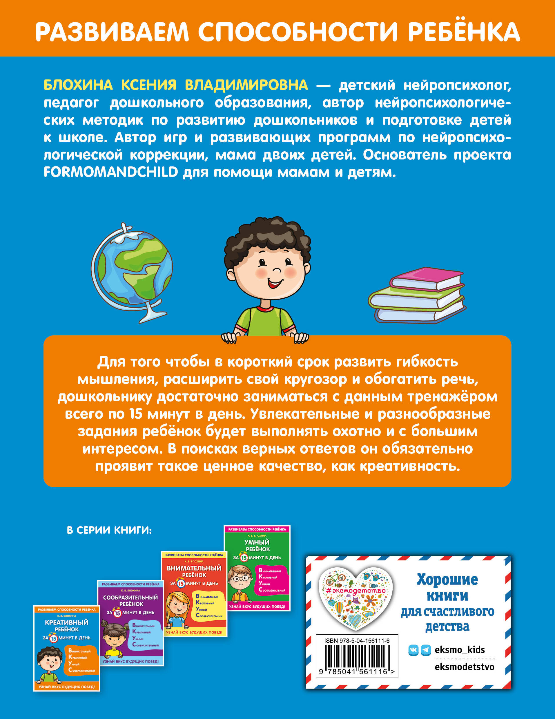 Креативное мышление играет важную роль в жизни каждого человека независимо от возраста. Творческие люди видят простор там, где остальные стиснуты узкими рамками догм и доктрин. Креативность можно и нужно развивать, причем в дошкольном возрасте это делать легче. Впоследствии, когда ребенок пойдет в школу, это качество будет весомым преимуществом. Продолжительность ежедневного занятия с данным тренажером можно ограничить 15-ю минутами в день. За это время предполагается выполнить два задания, расположенные рядом, на одном развороте. Этого достаточно, чтобы найти нешаблонные решения. Занимаясь лишь четверть часа в день, малыш в очень короткий срок научится: • выстраивать ассоциативные ряды; • мыслить образами; • находить несколько вариантов решения одной задачи.| Издательство | Эксмо |