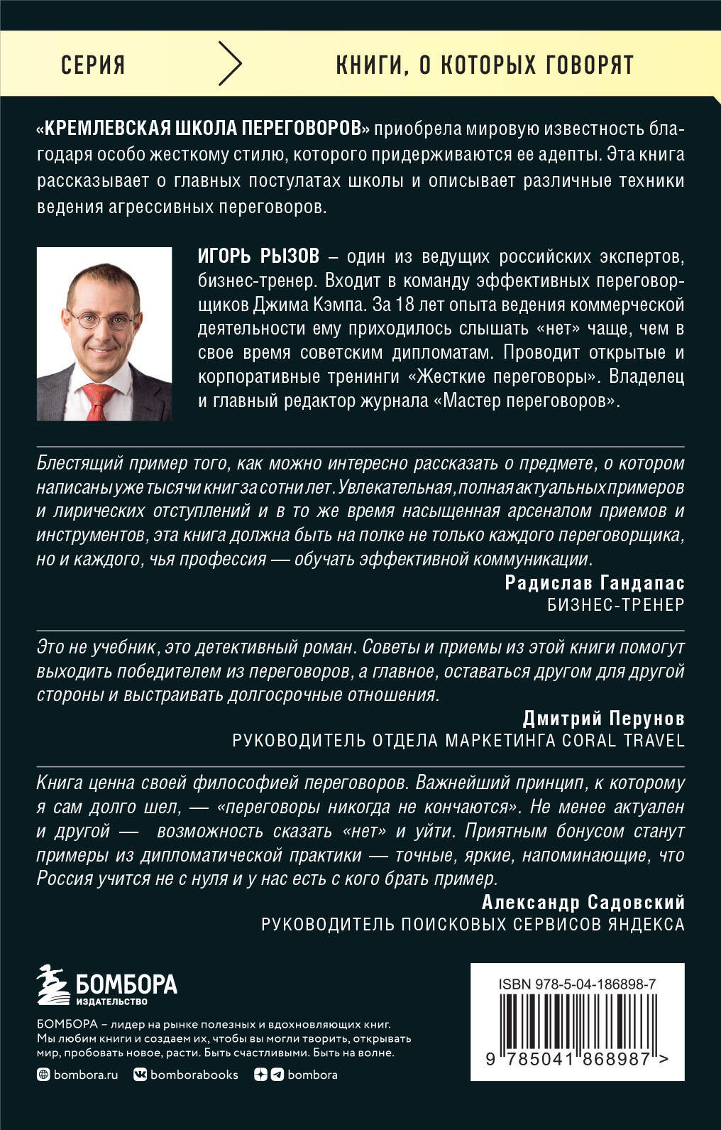 «Кремлевская школа переговоров», зародившаяся в 20-е годы минувшего века, стала одной из самых жестких переговорных школ в истории. Ее принципами руководствовались советские дипломаты, которым приходилось налаживать международные отношения СССР в условиях тотальной неприязни и недоверия. Зачастую они прибегали к самым агрессивным переговорным тактикам. Освоить все постулаты «Кремлевской школы» вам поможет эта книга. С ней вы научитесь: • Выходить победителем из любых переговоров. • Контролировать свои эмоции. • Превращать борьбу в сотрудничество. • Манипулировать своим оппонентом. • Вести переговоры в разных странах, не допуская фатальных ошибок. Все теоретические основы книги подкреплены примерами из реальной жизни и испытаны самим автором, Игорем Рызовым. Он является ведущим российским экспертом в области ведения переговоров. За его плечами - 18 лет опыта коммерческой деятельности, в течение которых он активно применял описанные им методики и уже готов поделиться ими с вами.| Издательство | ООО "Издательство "Эксмо" |