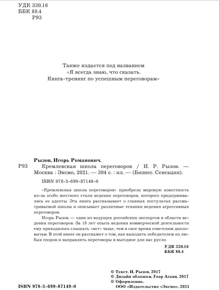 «Кремлевская школа переговоров» приобрела мировую известность из-за особо жесткого стиля ведения переговоров, которого придерживались ее адепты. Эта книга рассказывает о главных постулатах рассматриваемой школы и описывает различные техники ведения агрессивных переговоров. Игорь Рызов - один из ведущих российских экспертов в области ведения переговоров. За 18 лет опыта ведения коммерческой деятельности ему приходилось слышать «нет» чаще, чем в свое время советским дипломатам. В этой книге он расскажет о том, как выходить победителем из любых споров и направлять переговоры в выгодное для вас русло.| Издательство | Эксмо |