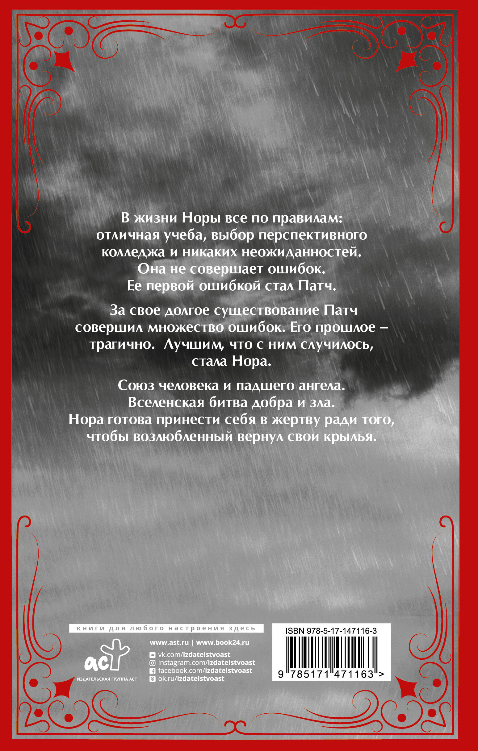 В жизни Норы все по правилам: отличная учеба, выбор перспективного колледжа и никаких неожиданностей. Она не совершает ошибок. Ее первой ошибкой стал Патч. За свое долгое существование Патч совершил множество ошибок. Его прошлое - трагично. Лучшим, что с ним случилось, стала Нора. Союз человека и падшего ангела. Вселенская битва добра и зла. Нора готова принести себя в жертву ради того, чтобы возлюбленный вернул свои крылья.| Издательство | АСТ |