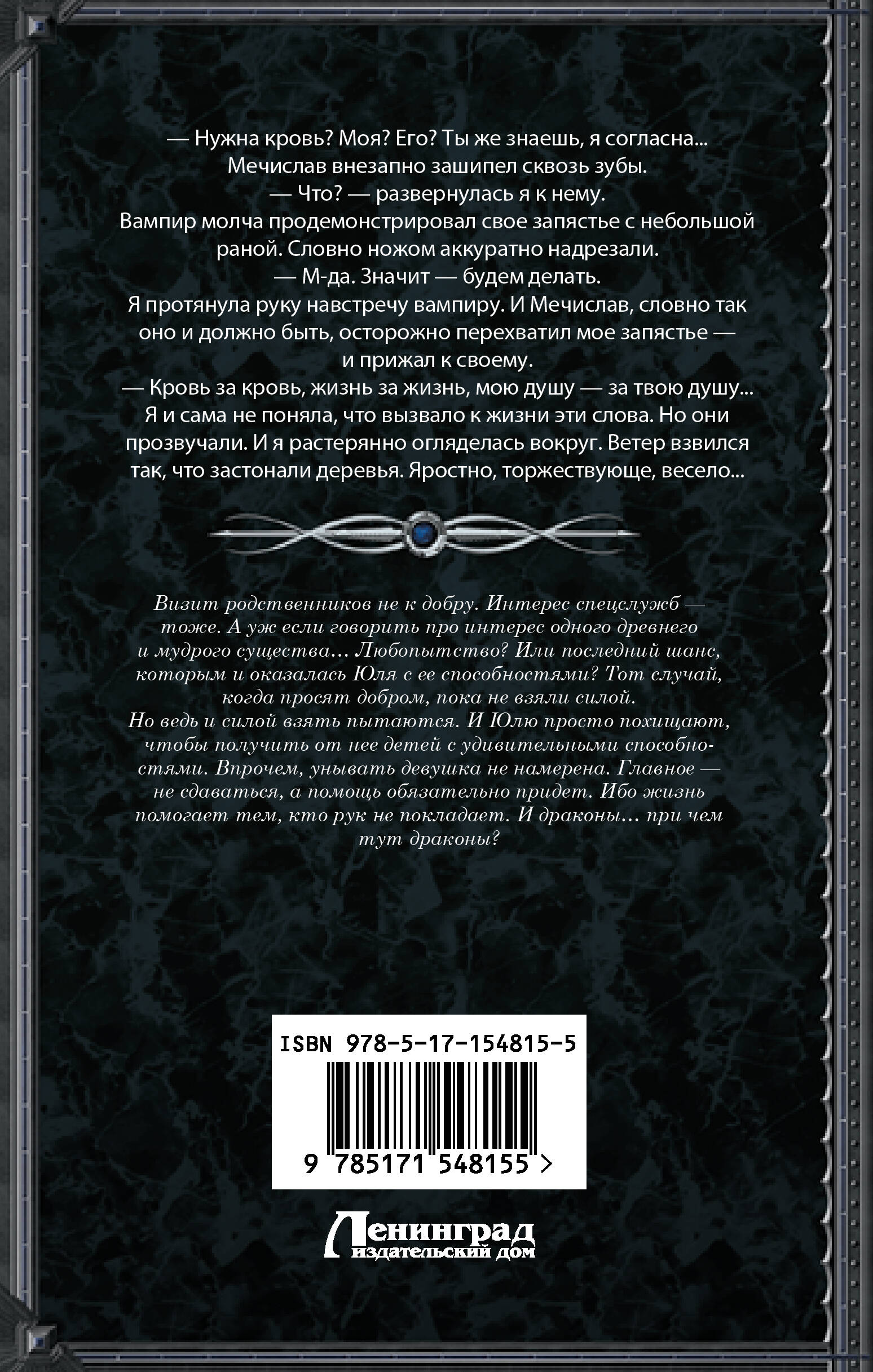 Визит родственников не к добру. Интерес спецслужб - тоже. А уж если говорить про интерес одного древнего и мудрого существа… Любопытство? Или последний шанс, которым и оказалась Юля с ее способностями? Тот случай, когда просят добром, пока не взяли силой. Но ведь и силой взять пытаются. И Юлю просто похищают, чтобы получить от нее детей с удивительными способностями. Впрочем, унывать девушка не намерена. Главное - не сдаваться, а помощь обязательно придет. Ибо жизнь помогает тем, кто рук не покладает. И драконы… при чем тут драконы?| Издательство | ИЗДАТЕЛЬСТВО "АСТ" |
