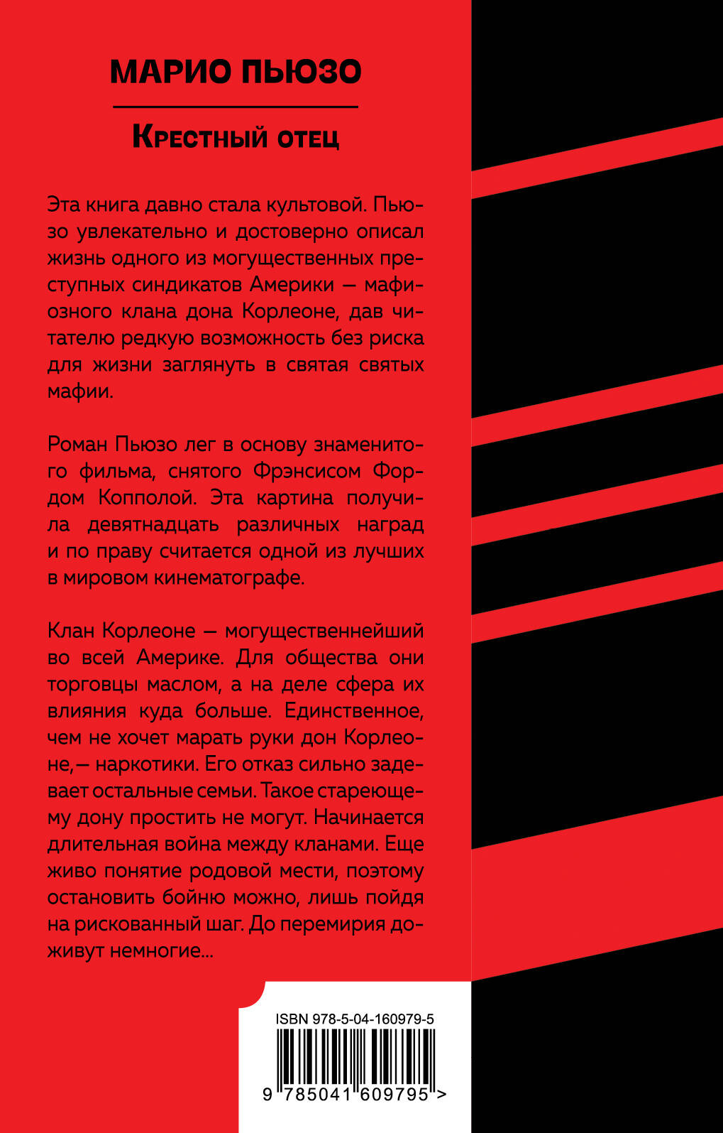 «Крестный отец» - классический роман о жизни одного из могущественных преступных синдикатов Америки - мафиозном клане дона Корлеоне. Написанная с потрясающей достоверностью книга позволяет читателю без риска для жизни заглянуть в святая святых мафии. Марио Пьюзо показал, как формируется иерархия в семейных кланах, каков механизм управления при принятии решений, познакомил с жизненным укладом преступных синдикатов. И все же это больше семейная сага, похожая на «Сагу о Форсайтах» Голсуорси. В жизни дона Корлеоне и членов его клана главное - это семья. В ней у каждого есть своя роль, свои обязанности, правила складываются десятилетиями. «Своих мало - чужие все».| Издательство | ООО "Издательство "Эксмо" |