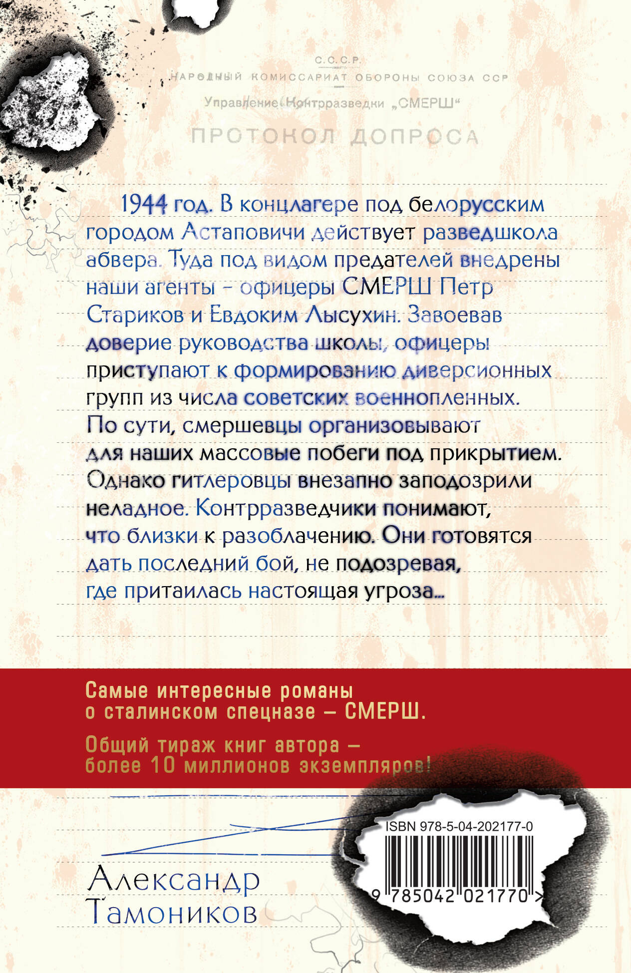 Самые интересные романы о сталинском спецназе - СМЕРШе. 1944 год. В концлагере под белорусским городом Астаповичи действует разведшкола абвера. Туда под видом предателей внедрены наши агенты - офицеры СМЕРШа Петр Стариков и Евдоким Лысухин. Завоевав доверие руководства школы, офицеры приступают к формированию диверсионных групп из числа советских военнопленных. По сути, смершевцы организовывают для наших массовые побеги под прикрытием. Однако гитлеровцы внезапно заподозрили неладное. Контрразведчики понимают, что близки к разоблачению. Они готовятся дать последний бой, не подозревая, где притаилась настоящая угроза… «Смерть шпионам!» (СМЕРШ) - это короткое и беспощадное название носило особое подразделение НКВД, подчинявшееся И. Сталину. Созданное в годы войны, оно состояло из проверенных в бою, честных и бесстрашных офицеров Красной Армии. СМЕРШа боялись все - и фашистские лазутчики, готовящие диверсии в наших боевых порядках, и гитлеровские приспешники, действующие в глубоком советском тылу. Враг знал: если на его след напали бойцы сталинского спецназа, справедливого и скорого суда не избежать. Романы серии «СМЕРШ - спецназ Сталина» - это каждый раз увлекательный динамичный сюжет и новые исторические знания, это экшен, написанный простым и понятным языком. Общий тираж книг А. Тамоникова - более 10 миллионов экземпляров!| Издательство | ООО "Издательство "Эксмо" |