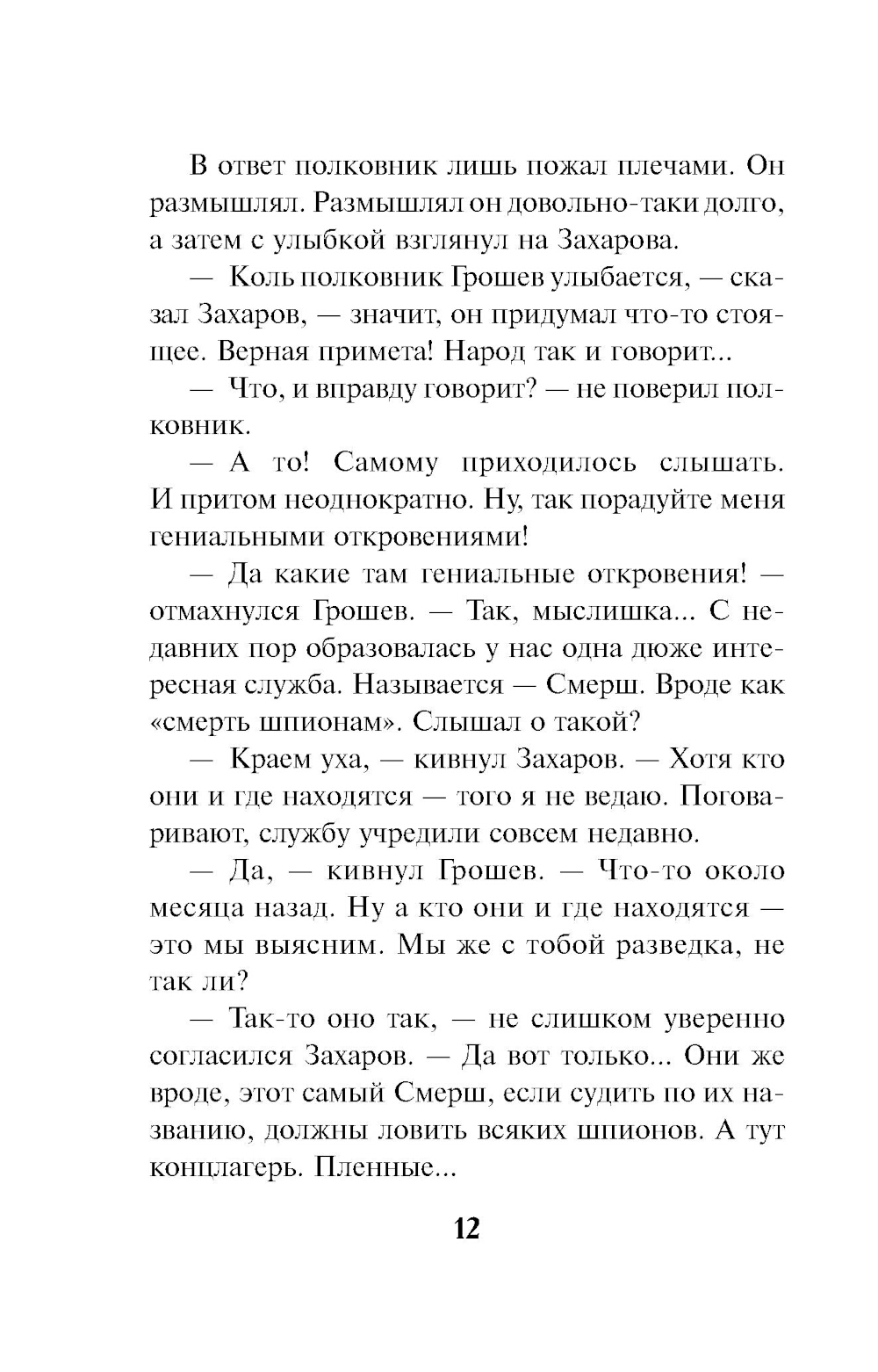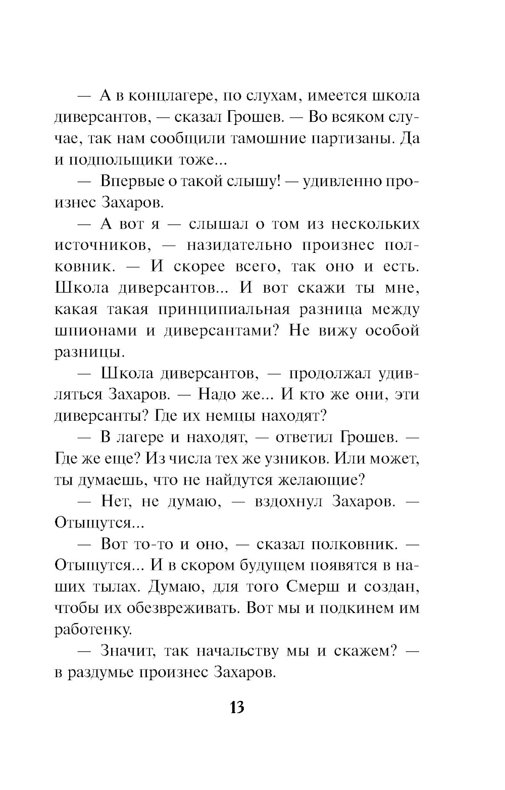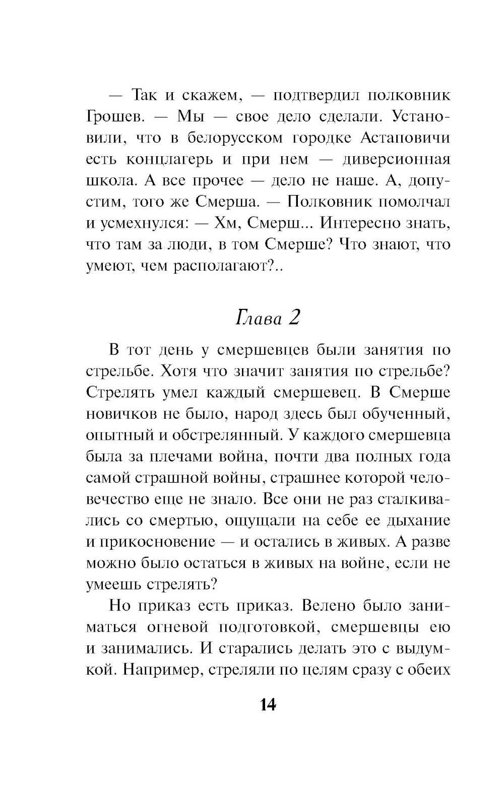 1944 год. В концлагере под белорусским городом Астаповичи действует разведшкола абвера. Туда под видом предателей внедрены наши агенты - офицеры СМЕРШ Петр Стариков и Евдоким Лысухин. Завоевав доверие руководства школы, офицеры приступают к формированию диверсионных групп из числа советских военнопленных. По сути, смершевцы организовывают для наших массовые побеги под прикрытием. Однако гитлеровцы внезапно заподозрили неладное. Контрразведчики понимают, что близки к разоблачению. Они готовятся дать последний бой, не подозревая, где притаилась настоящая угроза...| Издательство | Эксмо |