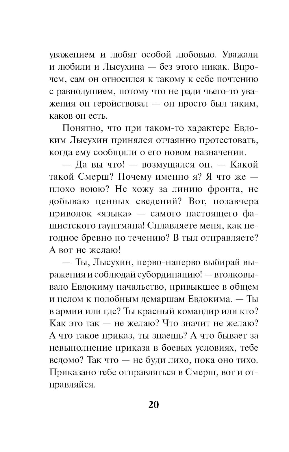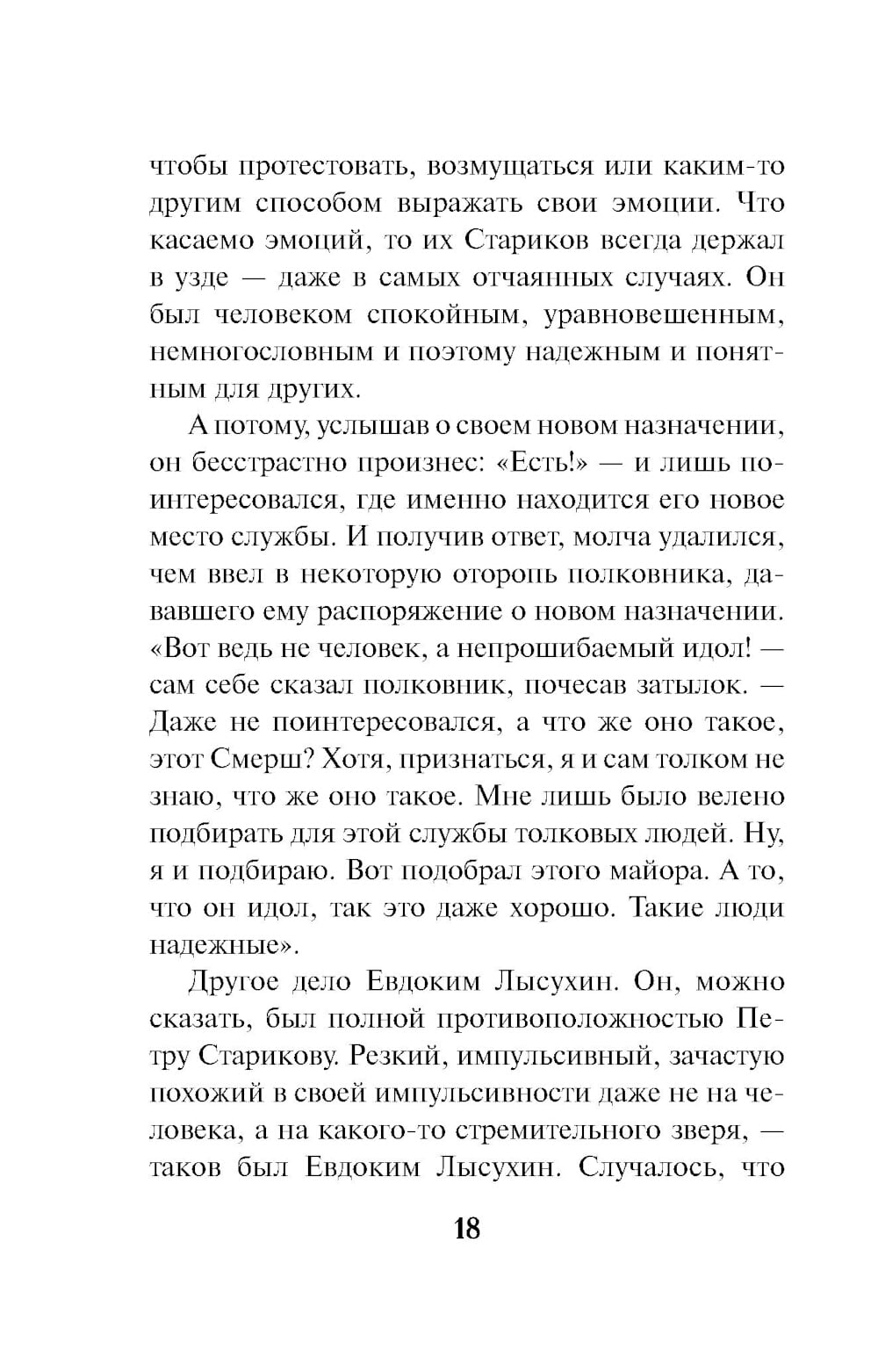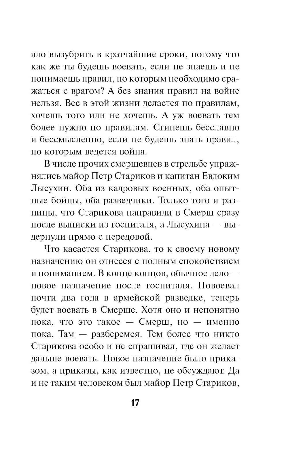 1944 год. В концлагере под белорусским городом Астаповичи действует разведшкола абвера. Туда под видом предателей внедрены наши агенты - офицеры СМЕРШ Петр Стариков и Евдоким Лысухин. Завоевав доверие руководства школы, офицеры приступают к формированию диверсионных групп из числа советских военнопленных. По сути, смершевцы организовывают для наших массовые побеги под прикрытием. Однако гитлеровцы внезапно заподозрили неладное. Контрразведчики понимают, что близки к разоблачению. Они готовятся дать последний бой, не подозревая, где притаилась настоящая угроза...| Издательство | Эксмо |