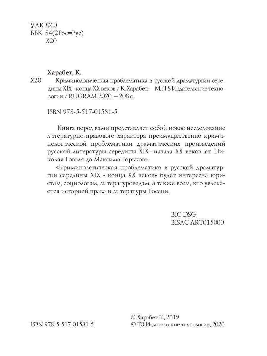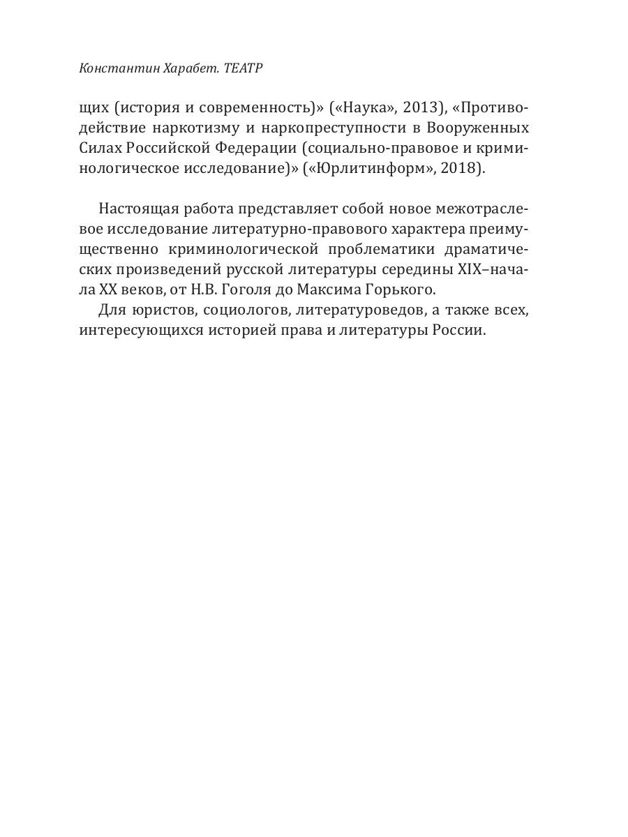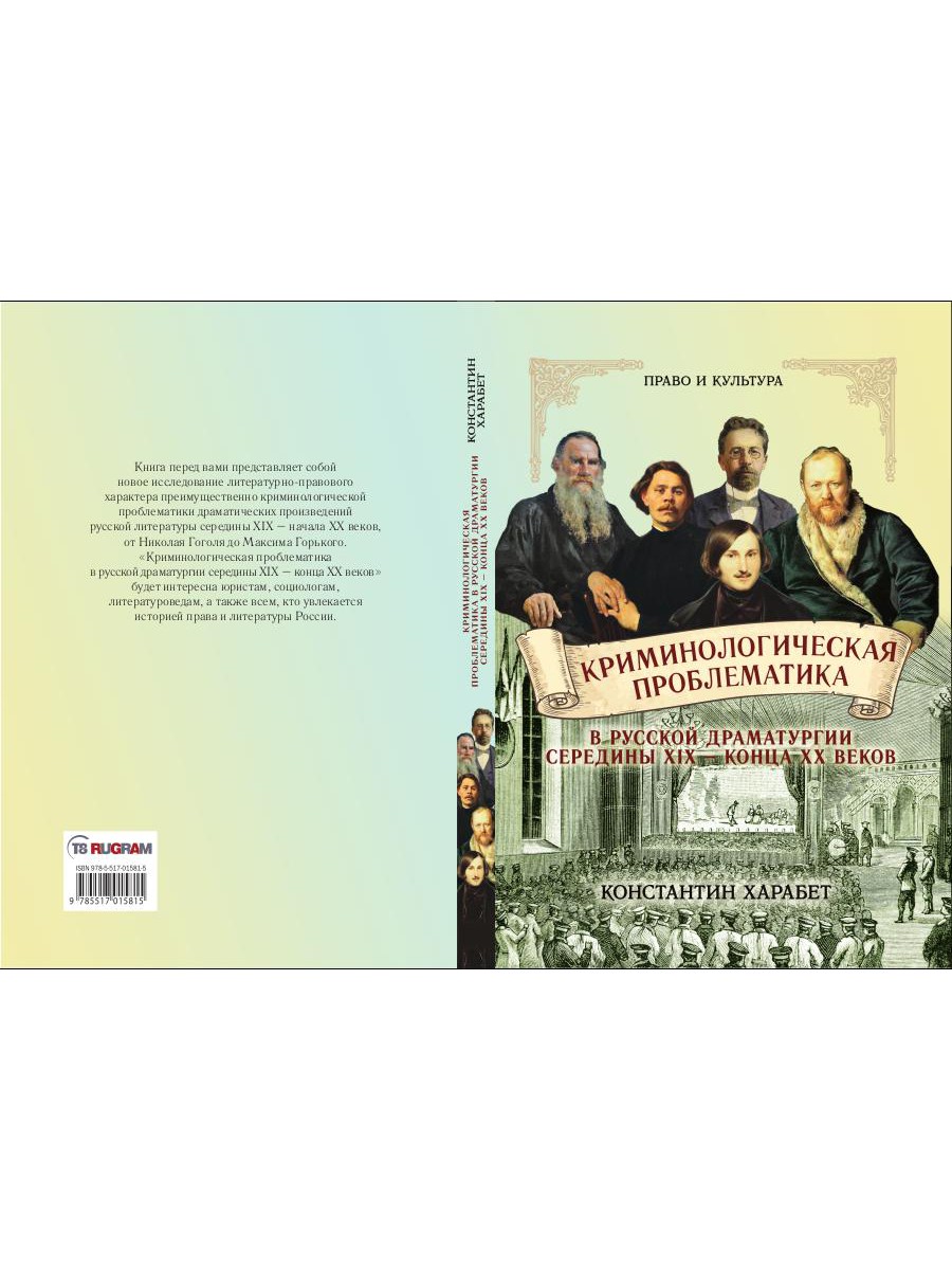 Книга перед вами представляет собой новое исследование литературно-правового характера преимущественно криминологической проблематики драматических произведений русской литературы середины XIX - начала XX веков, от Николая Гоголя до Максима Горького. «Криминологическая проблематика в русской драматургии середины XIX - конца XX веков» будет интересна юристам, социологам, литературоведам, а также всем, кто увлекается историей права и литературы России.| Издательство | Т8 RUGRAM |