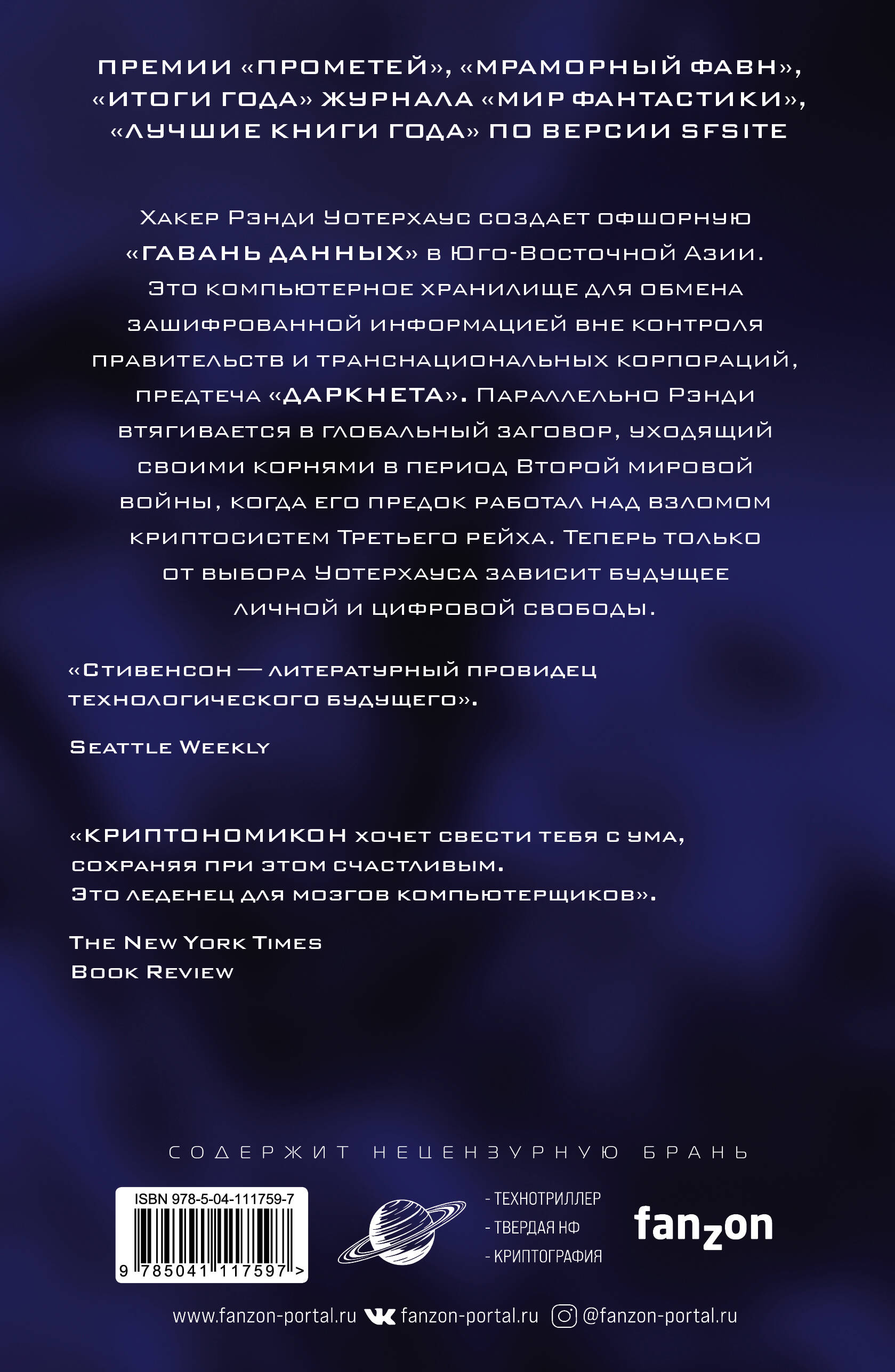 Премии «Локус», «Прометей», «Мраморный фавн», «Итоги года» журнала «Мир фантастики», «Лучшие книги года» по версии SFSite. «Криптономикон» - это захватывающая демонстрация силы и самая совершенная и впечатляющая работа Нила Стивенсона на сегодняшний день, глубокая, пророческая и гипнотическая. Это произведение великого искусства, мысли и творческой смелости - продукт подлинного воображения. Хакер Рэнди Уотерхаус создает оффшорную «гавань данных» в Юго-Восточной Азии. Это компьютерное хранилище для обмена зашифрованными файлами. Он втягивается в глобальный заговор, уходящий своими корнями в период Второй мировой войны, когда его предок работал над взломом нацистских криптосистем. Теперь только от его выбора зависит будущее личной и цифровой свободы. «Стивенсон - литературный провидец технологического будущего». - Seattle Weekly «КРИПТОНОМИКОН хочет свести тебя с ума, сохраняя при этом счастливым. Это леденец для мозгов компьютерщиков». - The New York Times Book Review «Стивенсон оправдывает свою репутацию литературного хакера со стальным взглядом». - Wired «Ироничный голос автора придает ощущение узнаваемости истории, которая выходит за рамки жанра и обращается к читателям как среди поклонников технотриллеров, так и среди более широкой аудитории. Очень рекомендую». - Library Journal